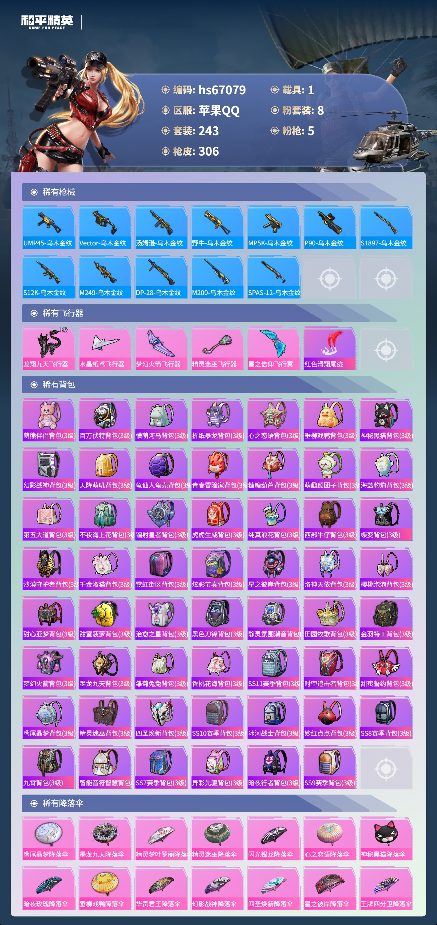hs67079 苹果手Q-12王牌印记-有战神框-1红装-8粉装-5特效枪-1载具-热力值-243套装-306枪皮-3卓越印记-1传奇印记