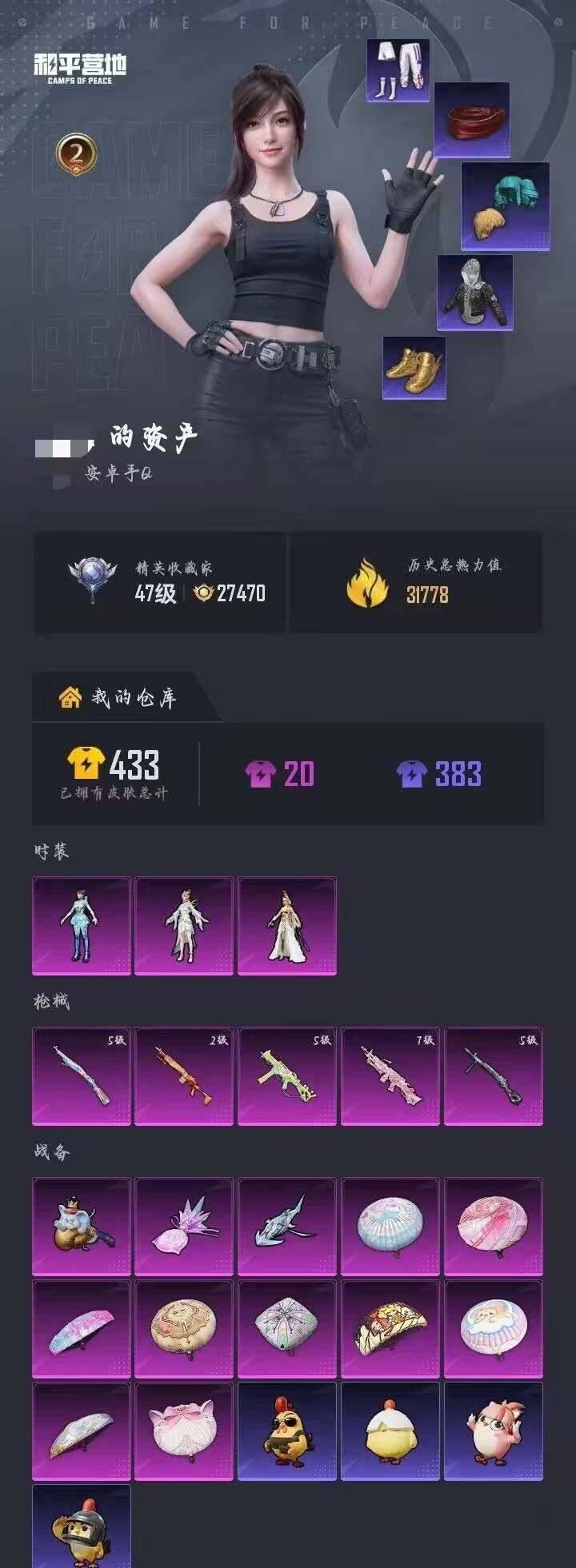 实名: 可修改 时装数: 348 枪械数: 108 战备数: 97 热门装扮: