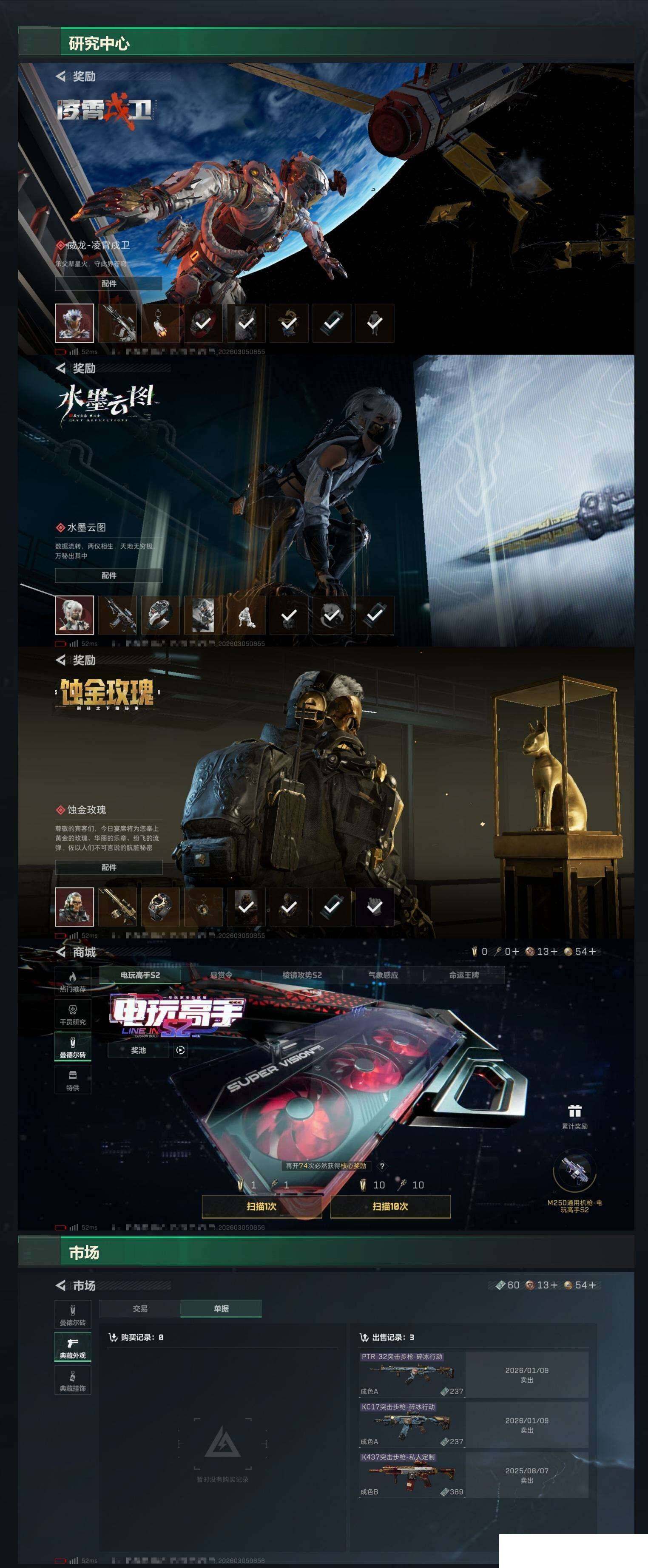 【sjs9052】可秒改二次!!119m+北极星 75发aw 信条 天际线 烽火地带段位: 黑鹰 全面战场段位: 列兵 总资产: 119000000 哈夫币: 2128000 sjs9052 干员外观: 露娜-黑·天际线,红狼-电锯惊魂,露娜-金牌射手(S7) 传说武器皮肤: 近战-北极星,K437突击步枪-北极星,QCQ171冲锋枪-北极星,M4A1突击步枪-阿米娅,CAR-15突击步枪-阿米娅,复合弓-黑-天际线,Vector冲锋枪-狩猎时刻,G3战斗步枪-狩猎时刻,M16A4突击步