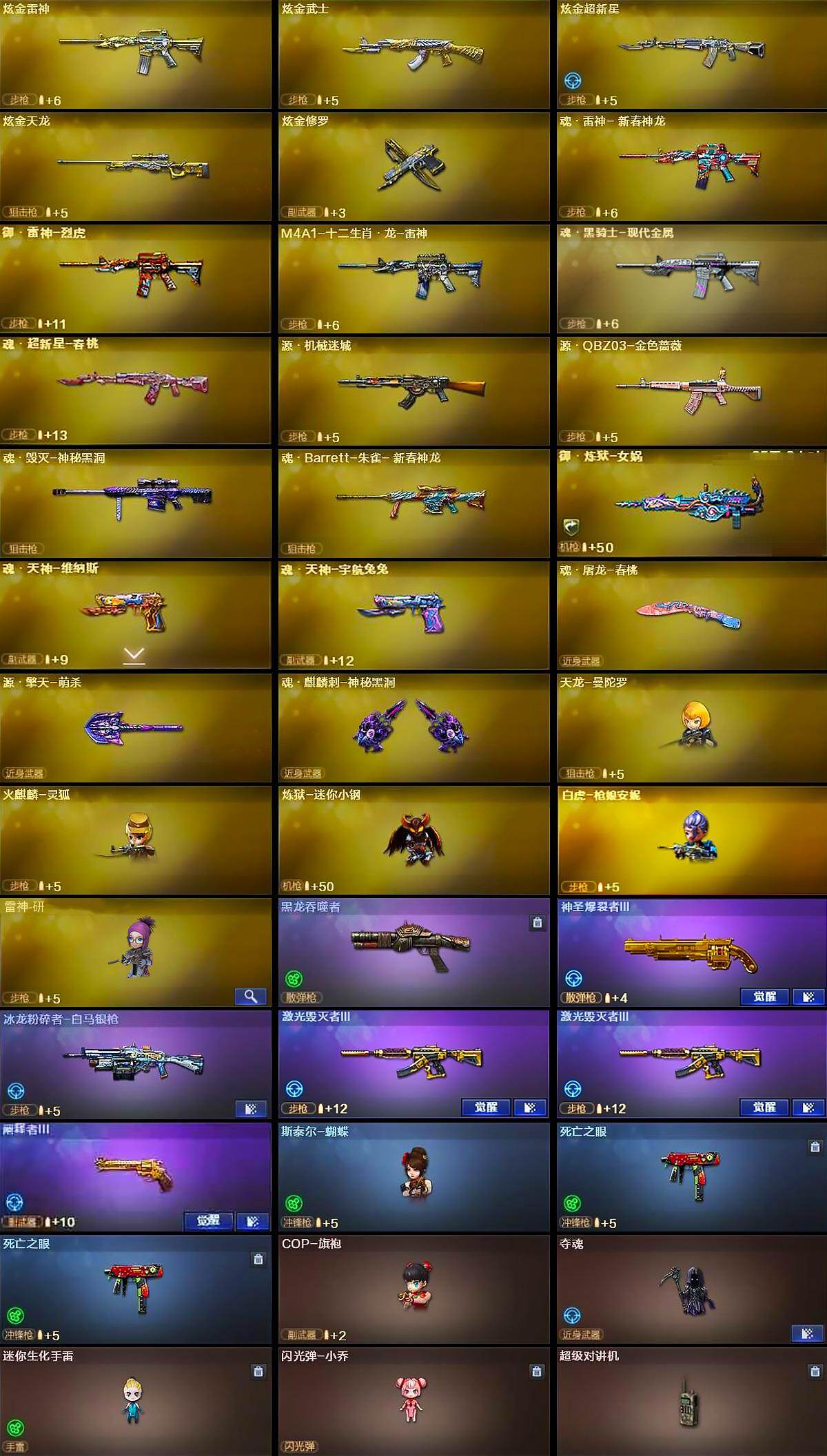 【热门武器】:QBZ03-金色蔷薇,M14EBR-玄武,HK417-朱雀,M4A1-青龙*2,M200-幻神,死亡之眼*2,炼狱-迷你小钢,M4A1-黑骑士*5,汤姆逊-烈龙*6,RPK-盘龙*6,加特林-炼狱,斯泰尔-蝴蝶,羊驼玩偶*2,降世魔童,白虎-枪娘安妮,USP-雷暴,COP-堕天神,COP 357-幻灵,沙鹰-修罗*5,金刚伞*2