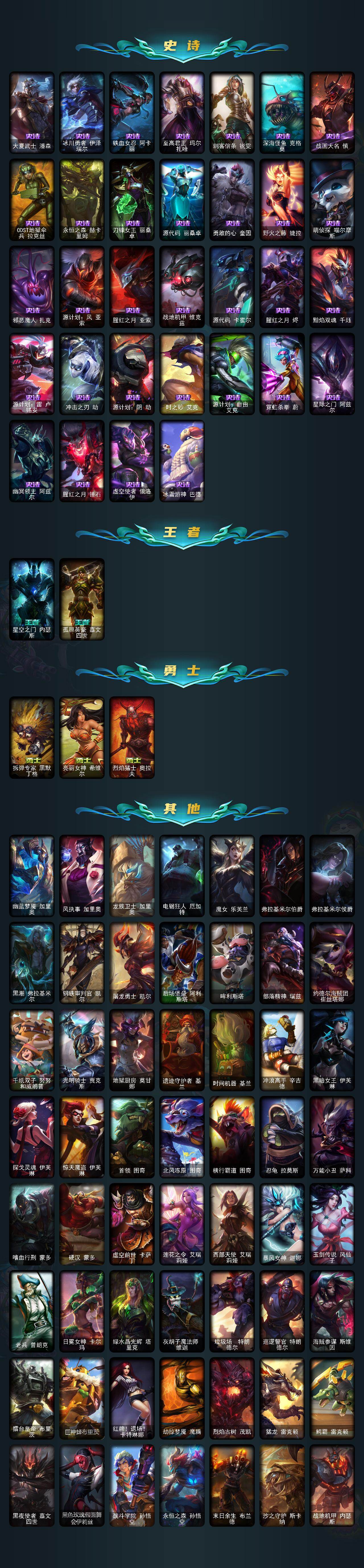 172英雄/223皮肤/5神话/28限定/8臻彩/81炫彩/17传说
