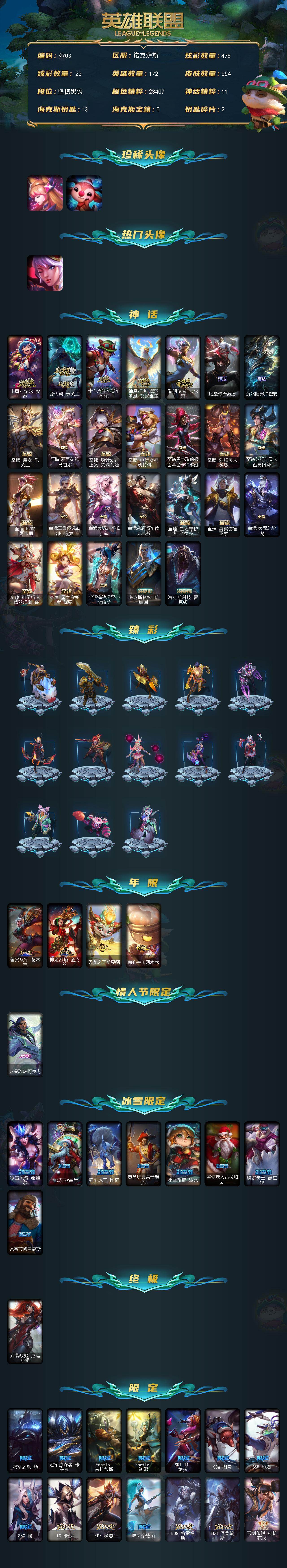 未定级段位-172英雄-554皮肤-478炫彩-1终极-26神话-56限定-61传说-104史诗