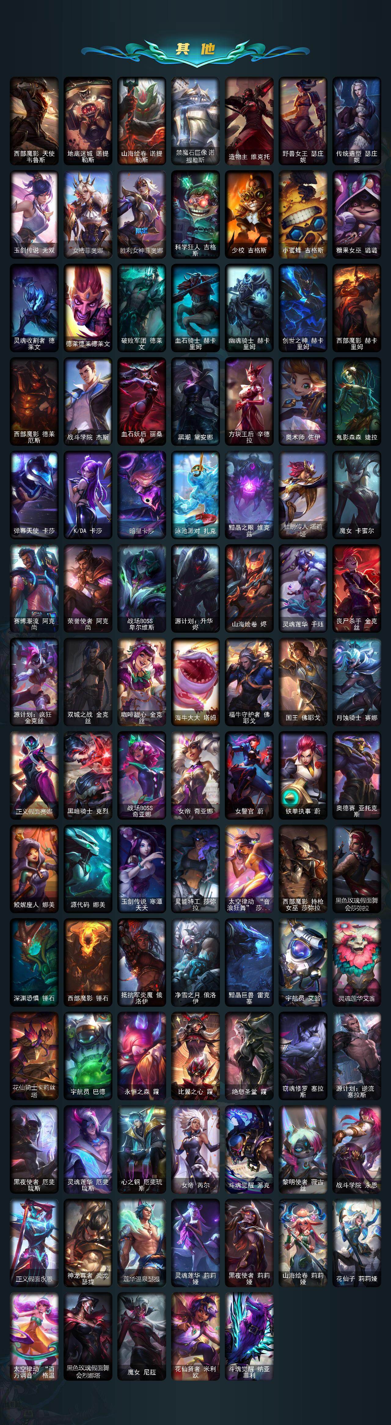 【神话皮肤】:十周年纪念安妮,源代码乐芙兰,十五周年纪念希维尔,神凰行者瑞羽圣凰艾尼维亚,黎明使者卡尔玛,殿堂传奇薇恩,沉溺暗影卢锡安