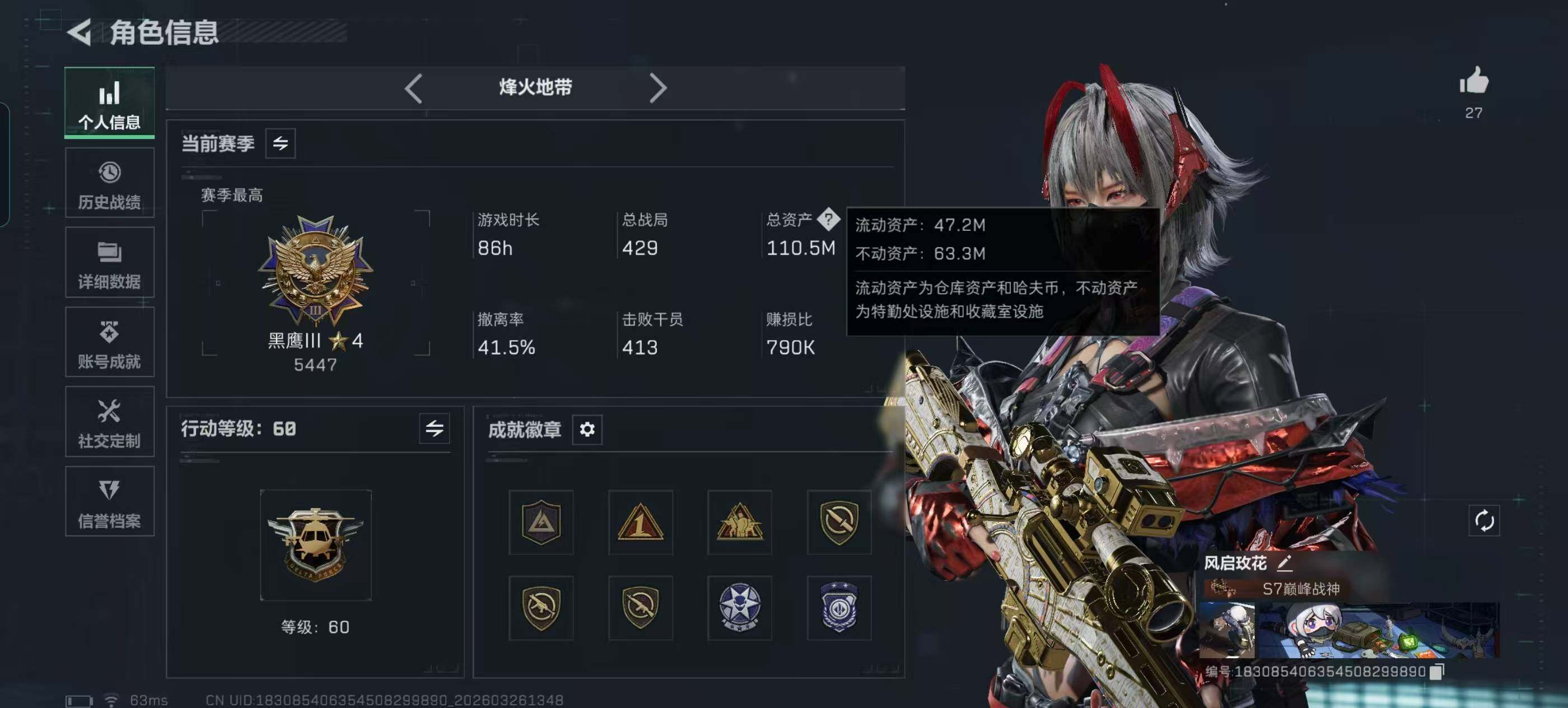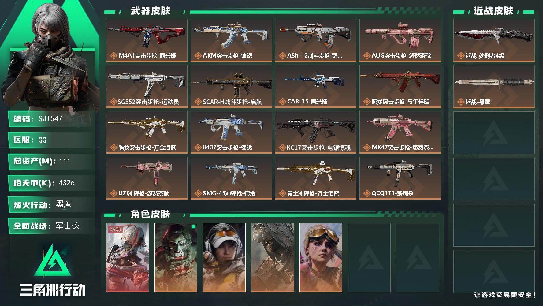 【SJ1547】111m总资产-4326k哈夫币-60烽火等级-黑鹰-33战场等级-军士长