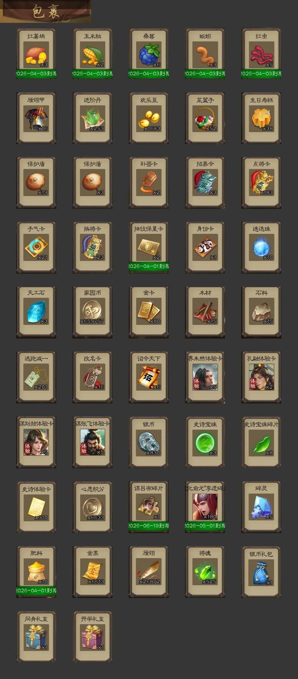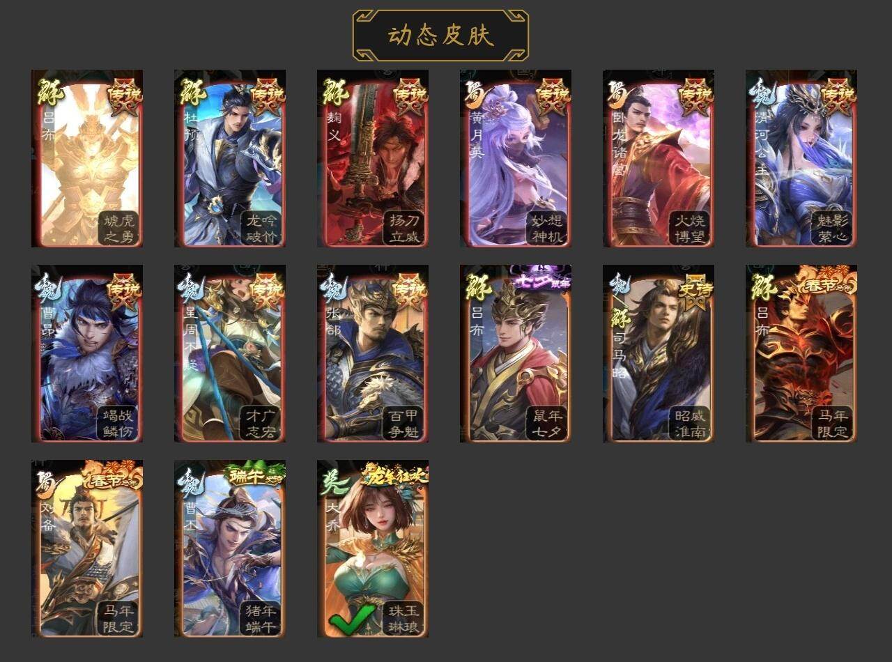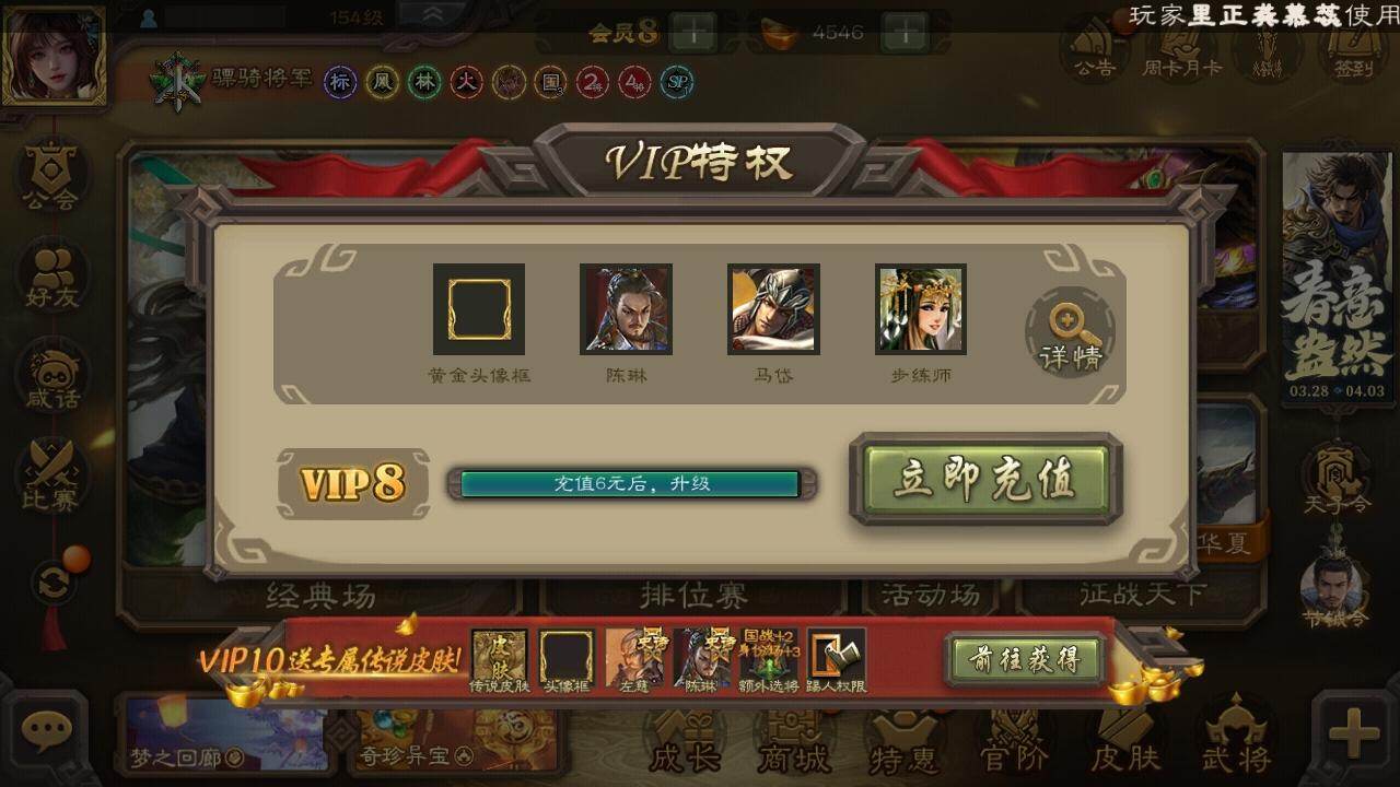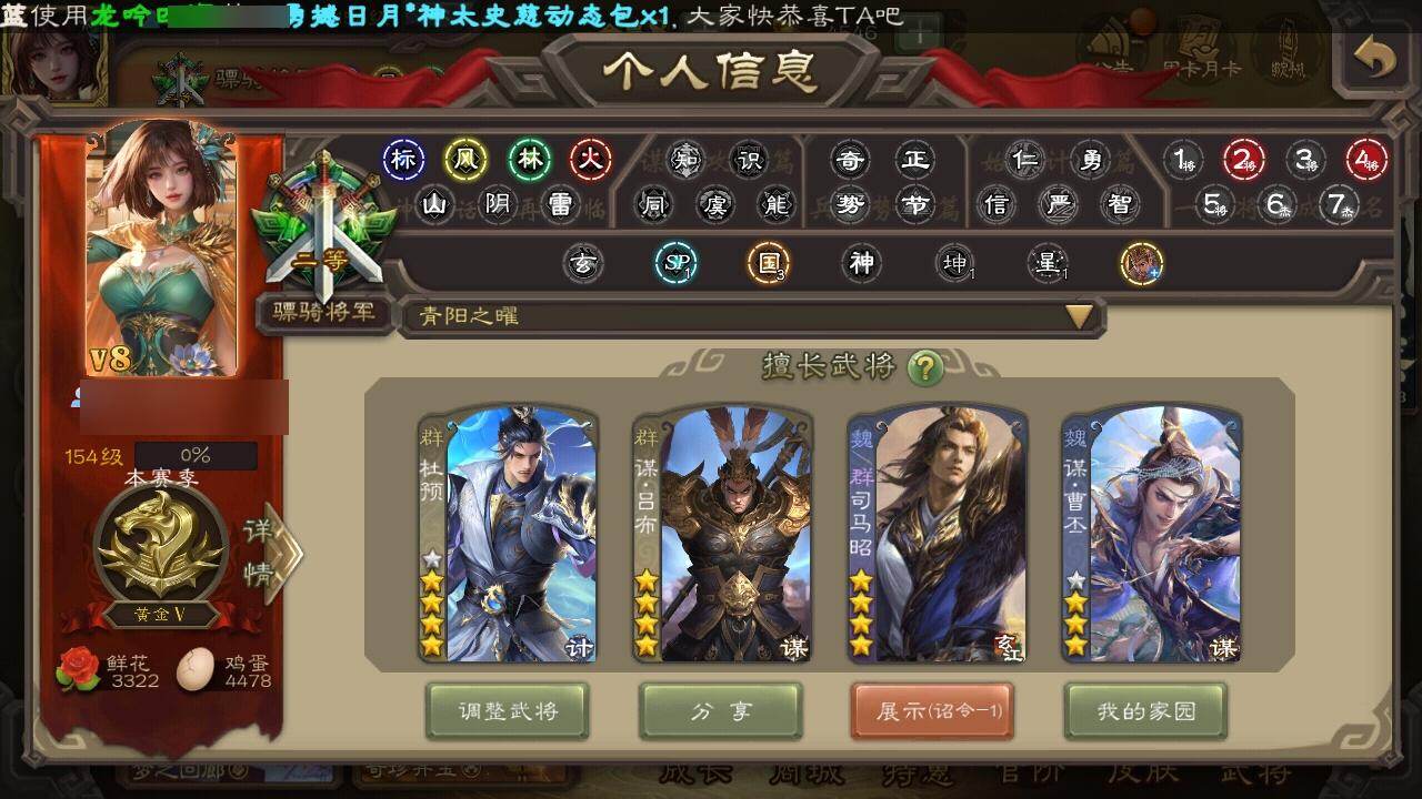 官阶:骠骑将军;VIP等级:VIP8;史诗武将数量:32;动态皮肤数量:14;
