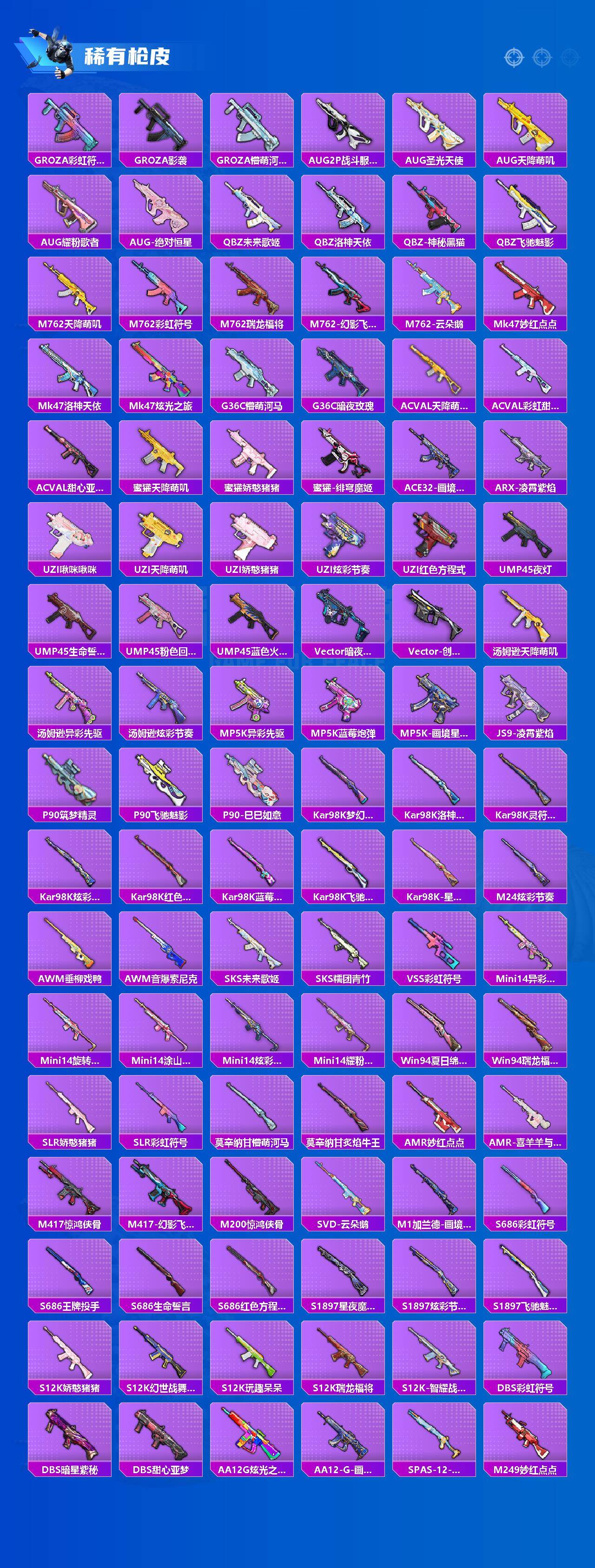 【粉色枪皮等级】:M416-风花雪月(七级),ACE32-萌骑漫游(五级),Kar98K-巳巳如意(五级),Mk14-福马献瑞(五级),DP-28-豹影疾电(五级)