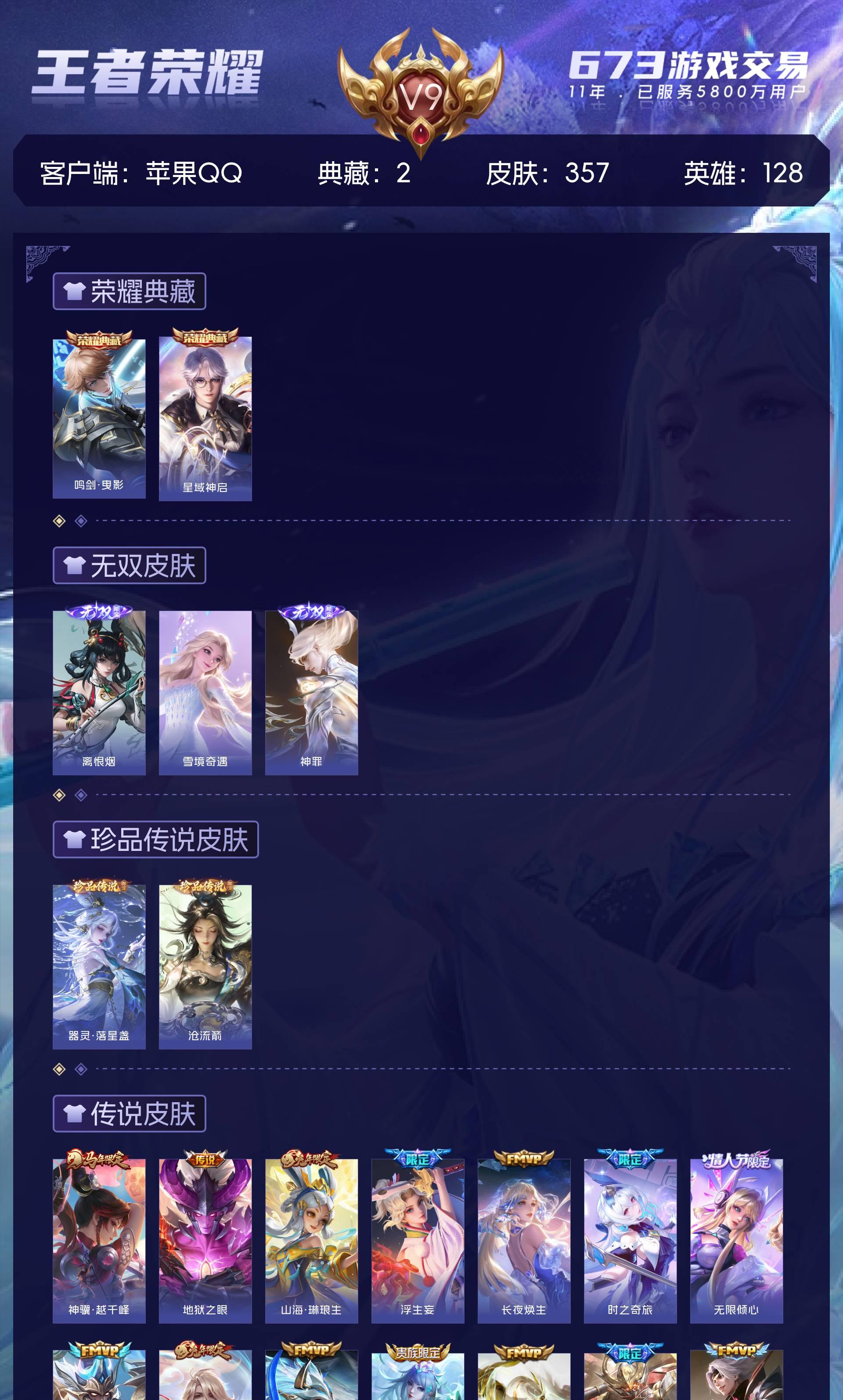 苹果QQ/荣耀王者/357皮肤/128英雄/2典藏/0珍品无双/3无双/2珍品传说/25传说/112