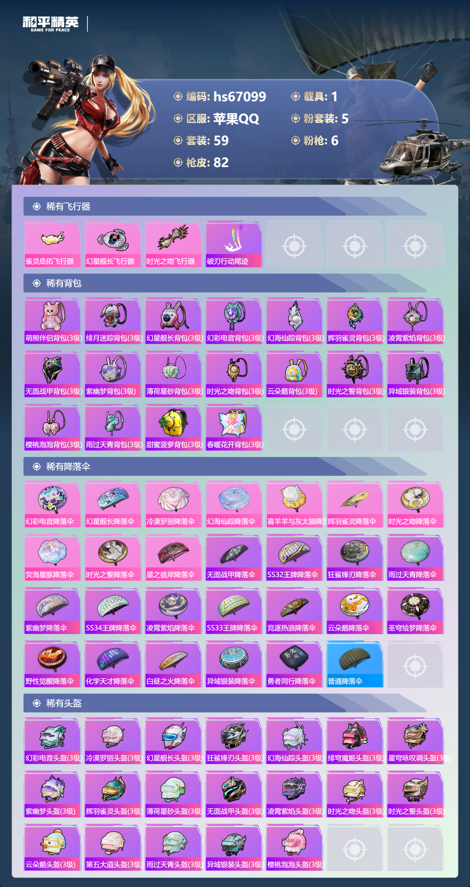 hs67099 苹果手Q-4王牌印记-有战神框-1红装-5粉装-6特效枪-1载具-29929热力值-59套装-82枪皮-4卓越印记-3传奇印记