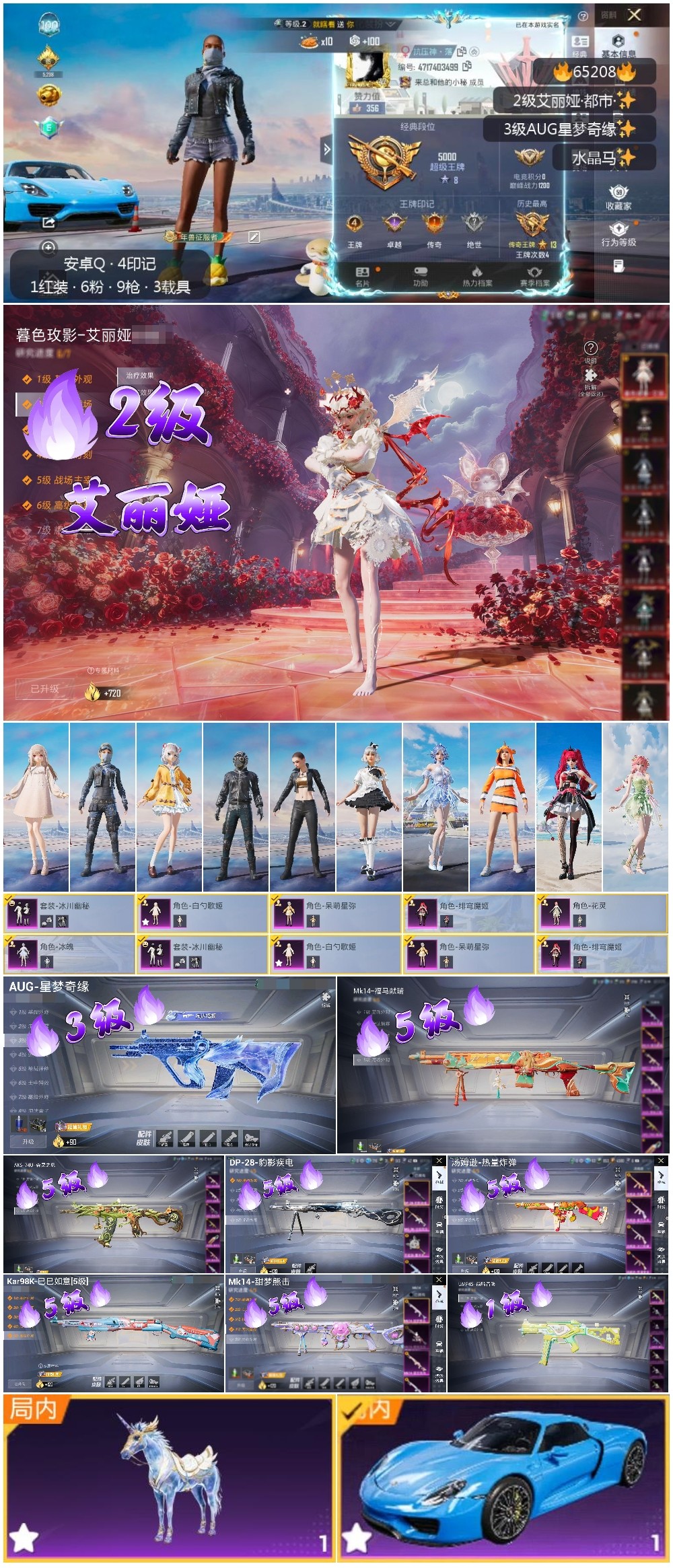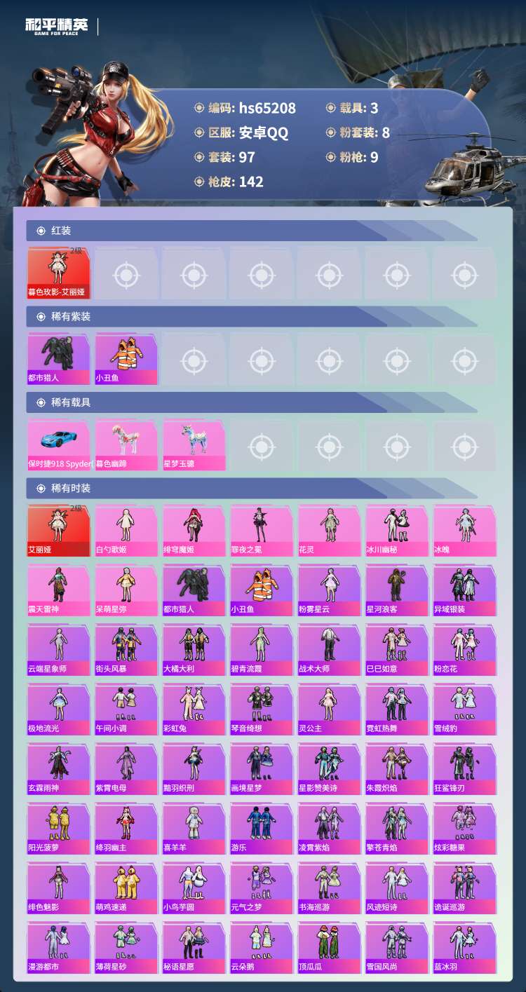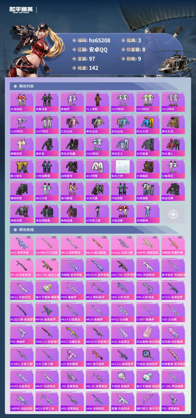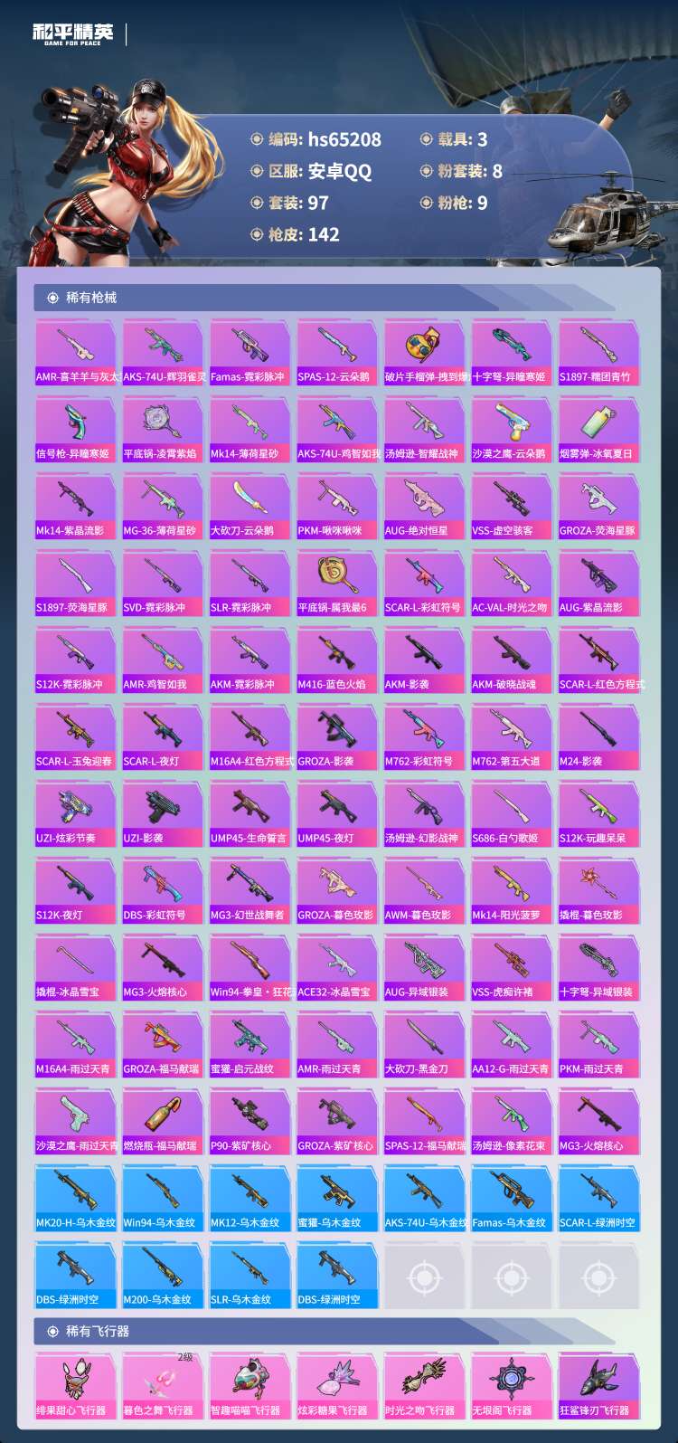 hs65208 安卓手Q-4王牌印记-1红装-8粉装-9特效枪-3载具-46839热力值-97套装-