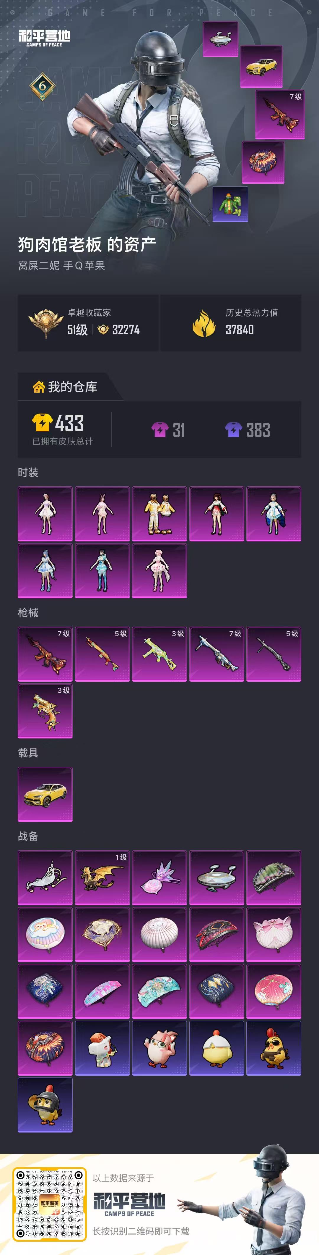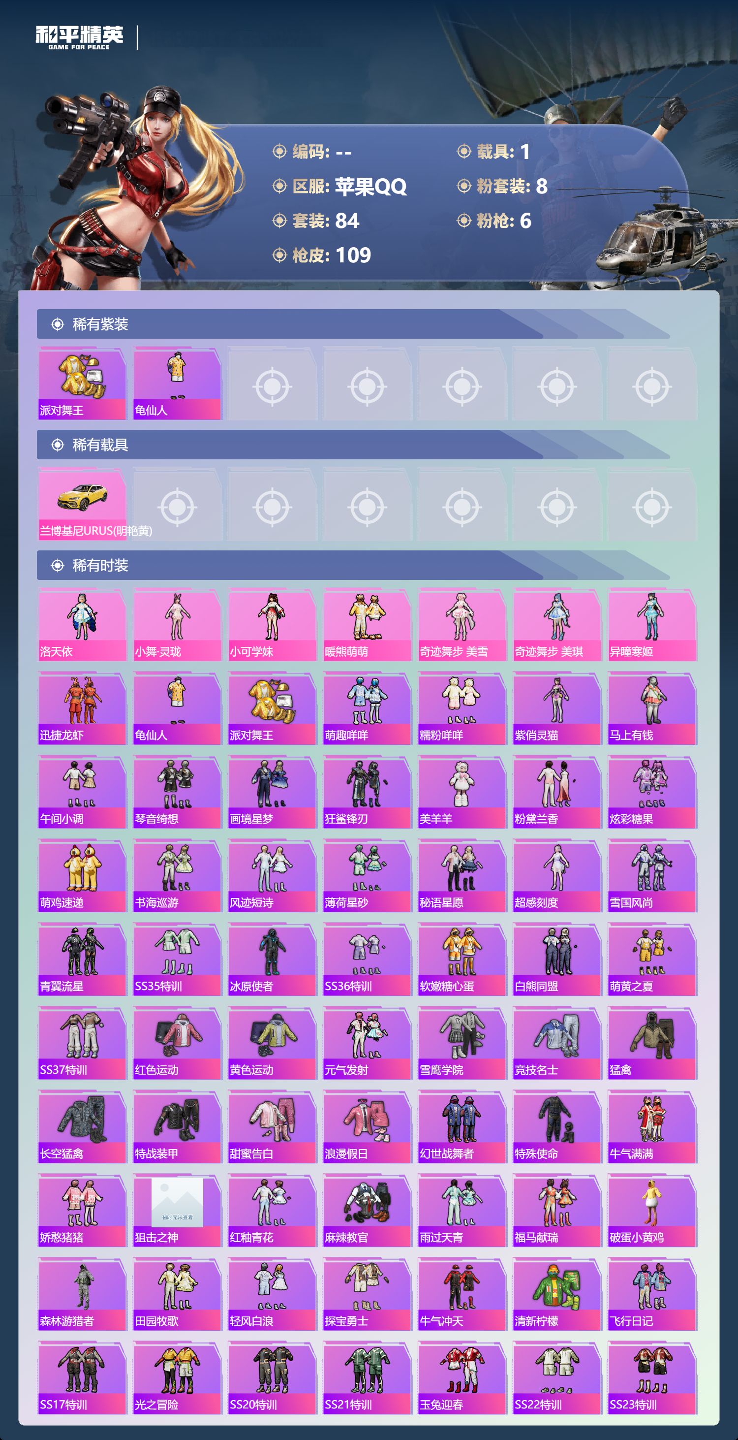hs67193 苹果手Q-6王牌印记-8粉装-6特效枪-1载具-37888热力值-84套装-109枪皮