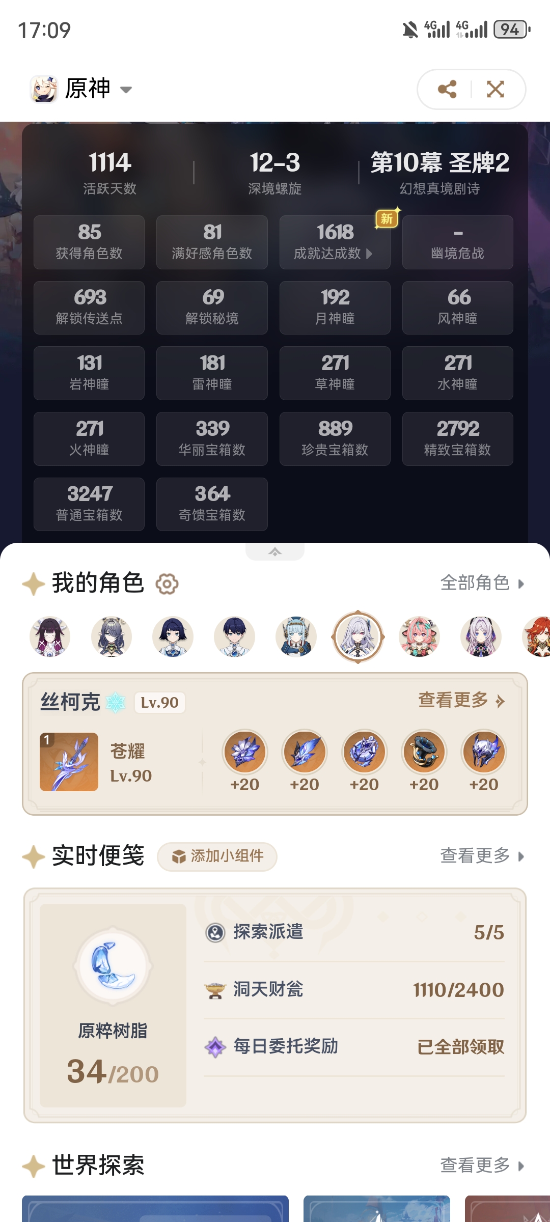 花了七八千 大小月卡没断过 任务全清 角色多 满探索