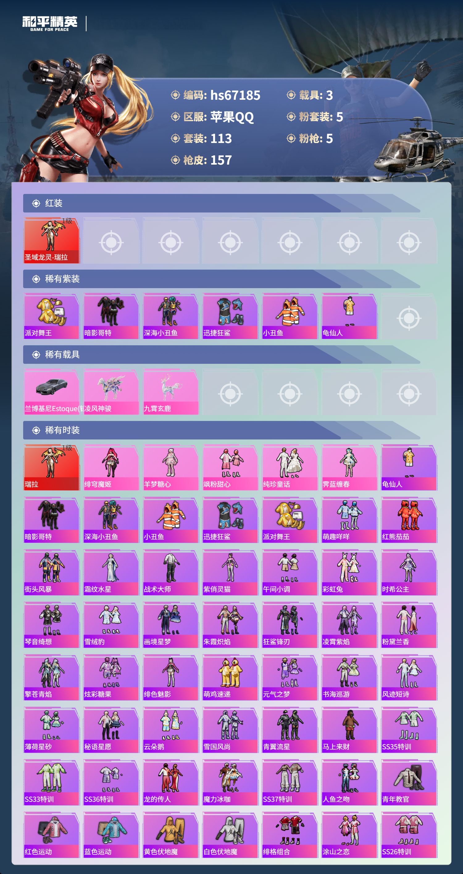 hs67185 苹果手Q-6王牌印记-1红装-5粉装-5特效枪-3载具-49844热力值-113套装-157枪皮-2卓越印记
