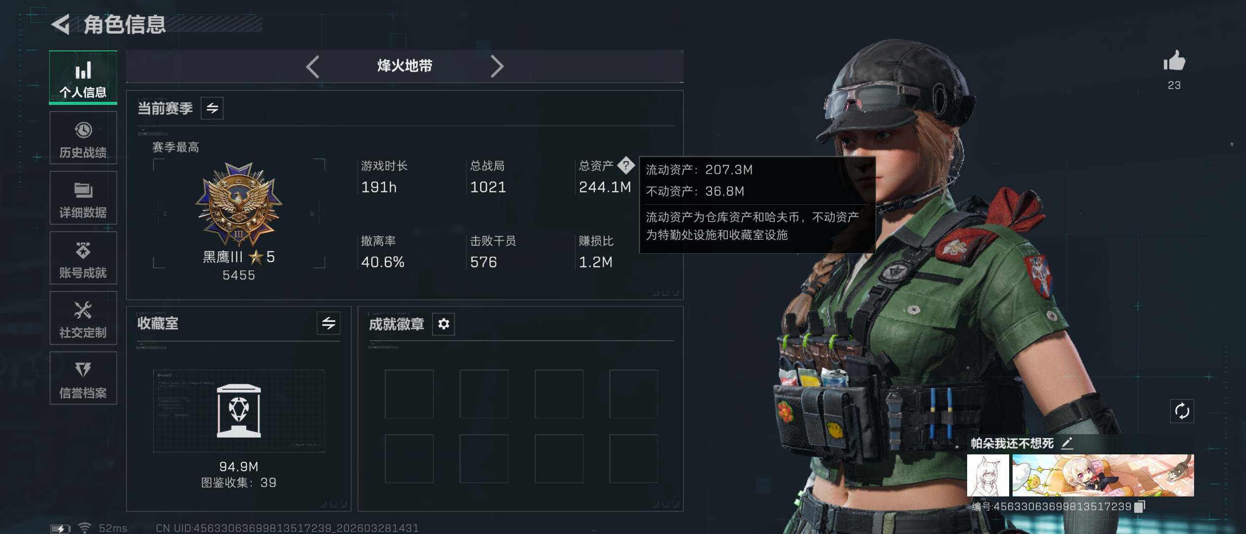244m总资产-50857k哈夫币-60烽火等级-黑鹰-13战场等级-列兵