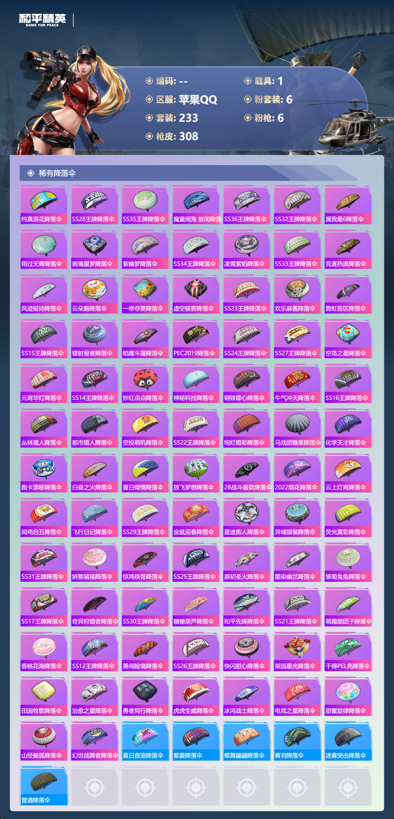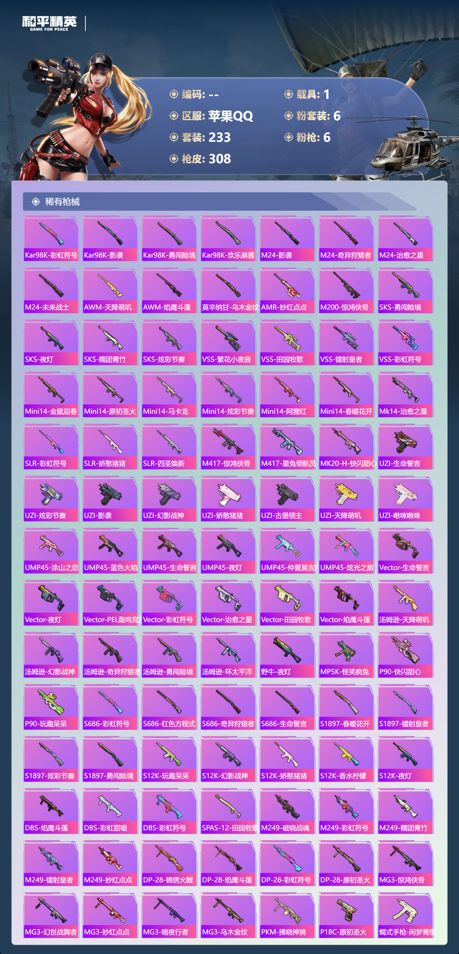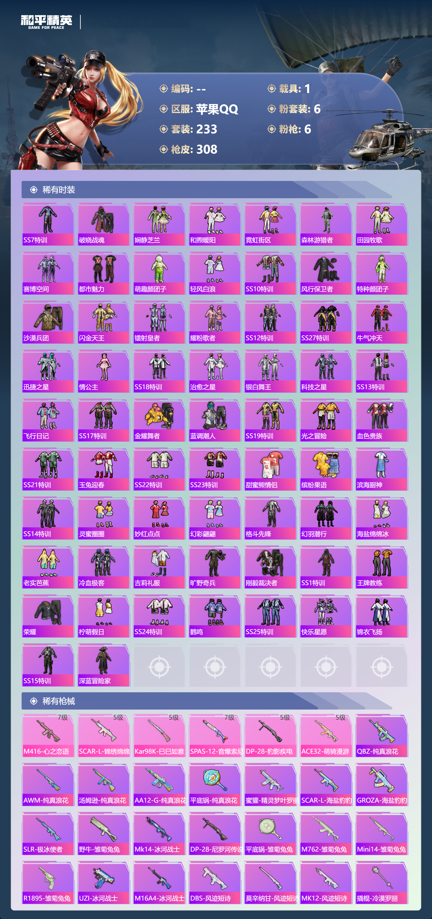 hs67155 苹果手Q-22王牌印记-6粉装-6特效枪-1载具-98266热力值-233套装-308枪皮-3卓越印记-1传奇印记