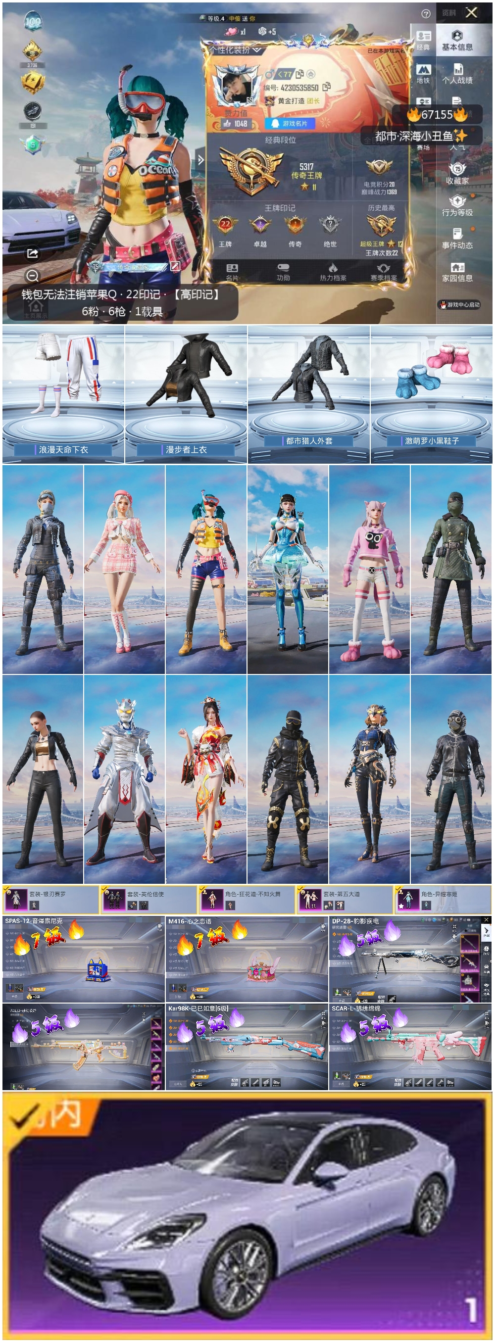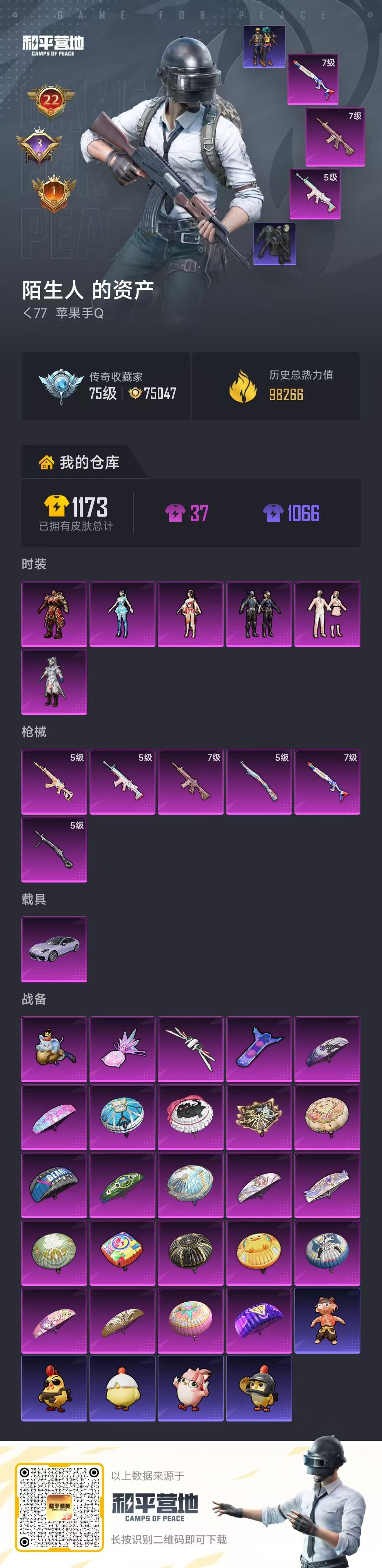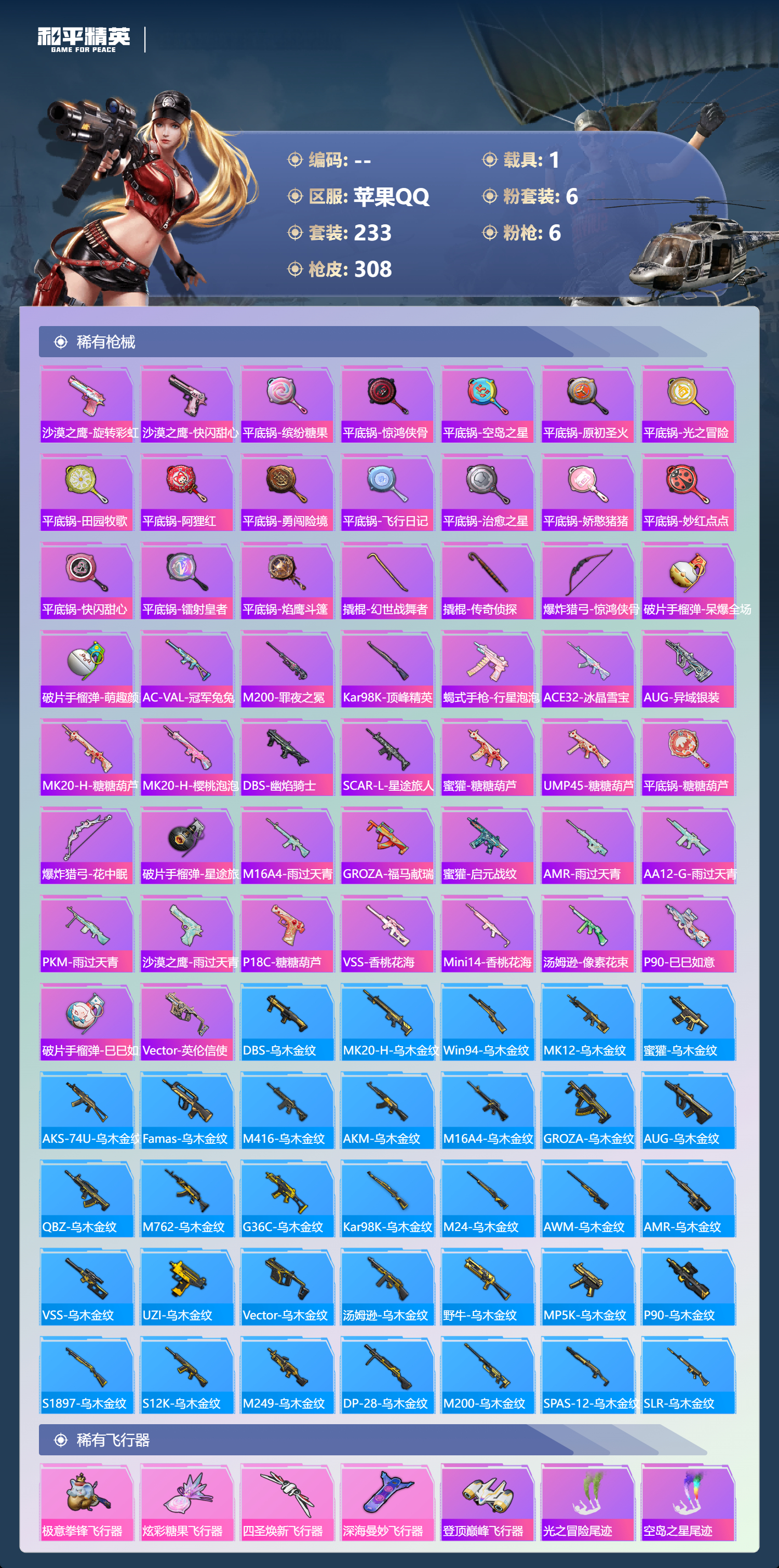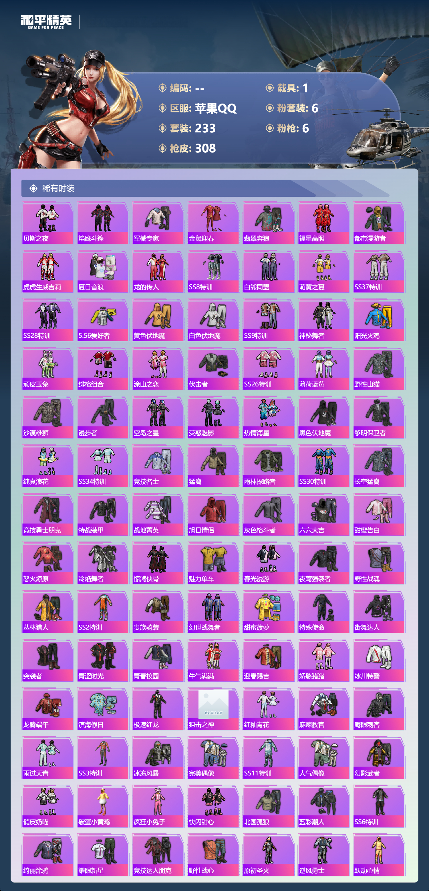 hs67155 苹果手Q-22王牌印记-6粉装-6特效枪-1载具-98266热力值-233套装-308枪皮-3卓越印记-1传奇印记