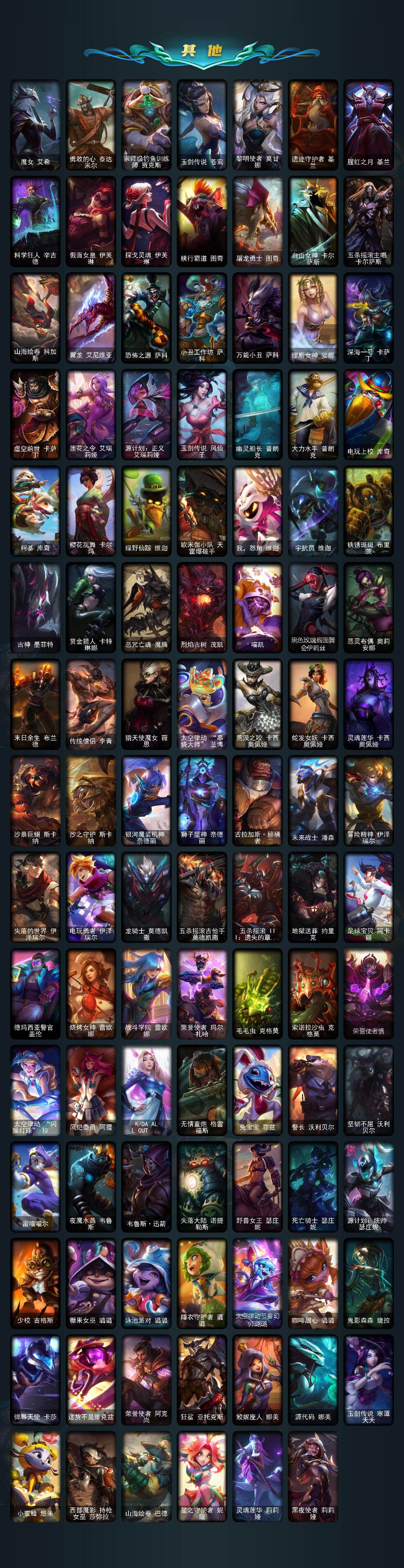 【臻彩皮肤】:冠军之志瑞兹凯旋圣装,冠军之血希瓦娜凯旋圣装,天煞劫恒星游历者,黎明使者锐雯黑夜使者,海之歌艾希冰爽浪花,魔女阿卡丽虚荣,净雪之月莫甘娜冬虹