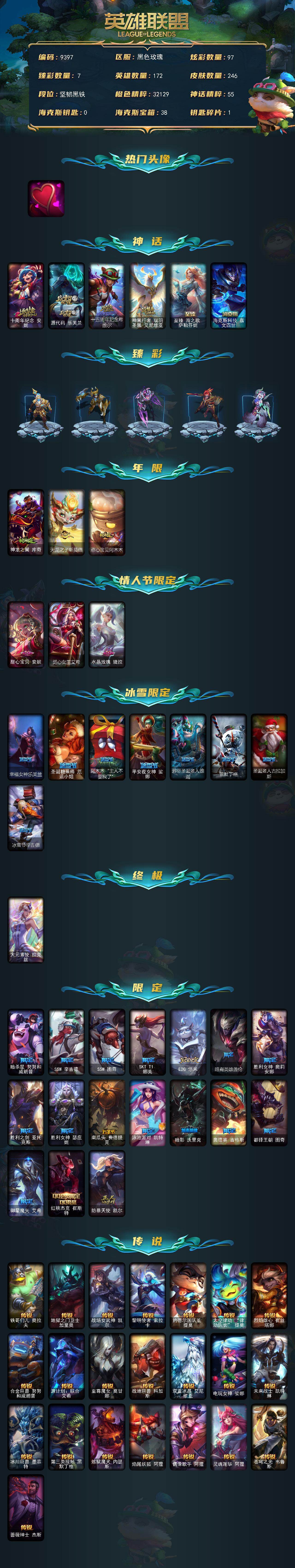未定级段位-172英雄-246皮肤-97炫彩-1终极-6神话-31限定-22传说-57史诗