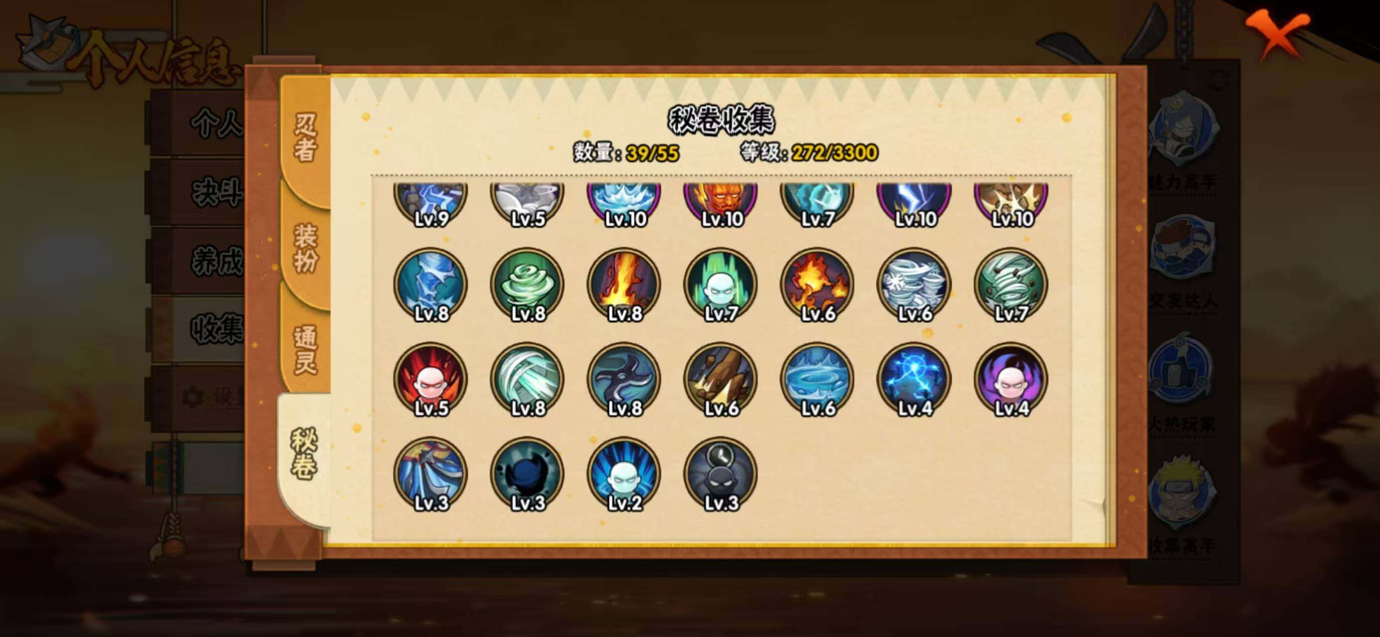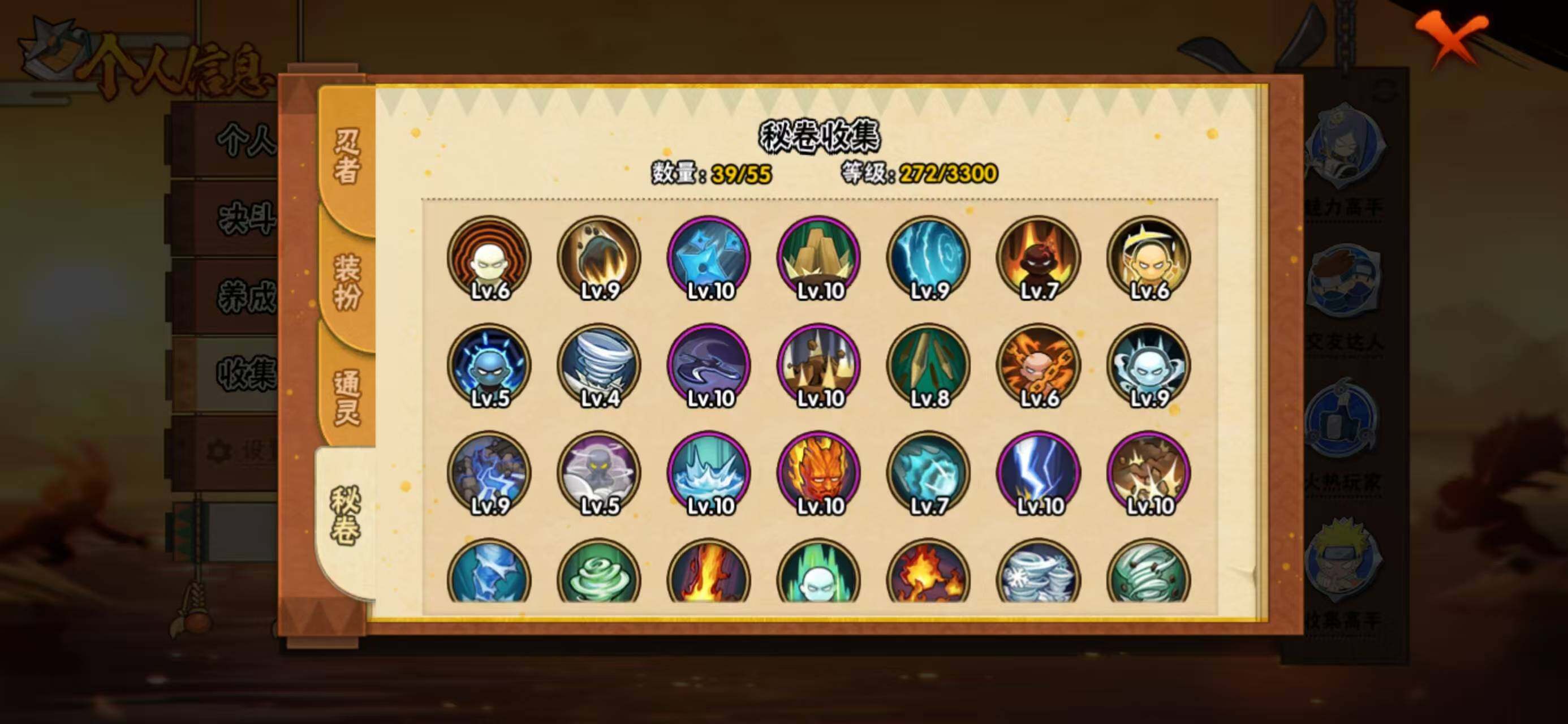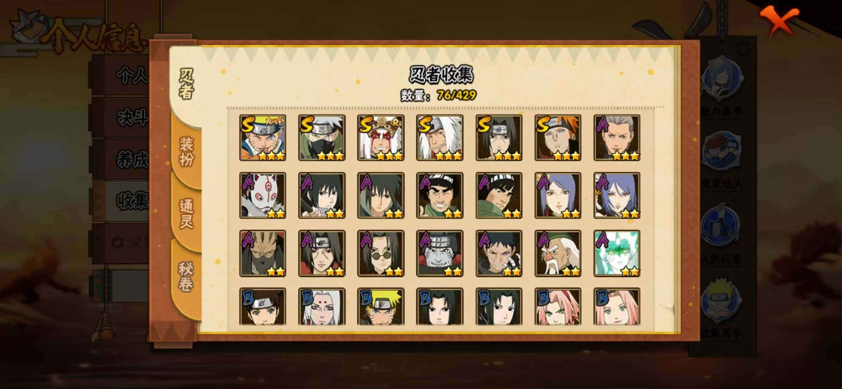 【S级忍者】:宇智波鼬「须佐能乎」(3星),旗木卡卡西「须佐能乎」(3星),自来也「舞之豪杰」(3星),自来也「传说中的三忍」(3星),佩恩「天道」(3星),漩涡鸣人·宇智波佐助(3星)