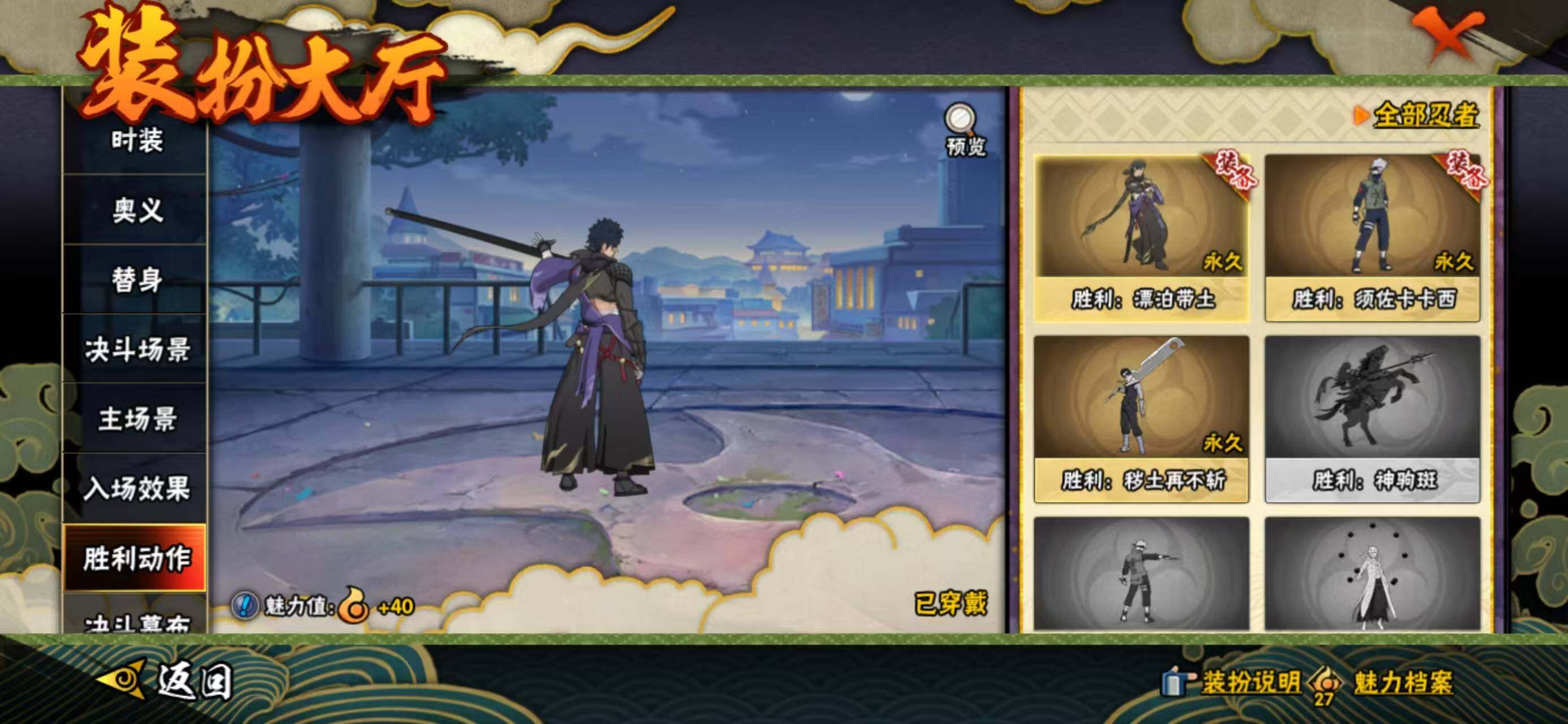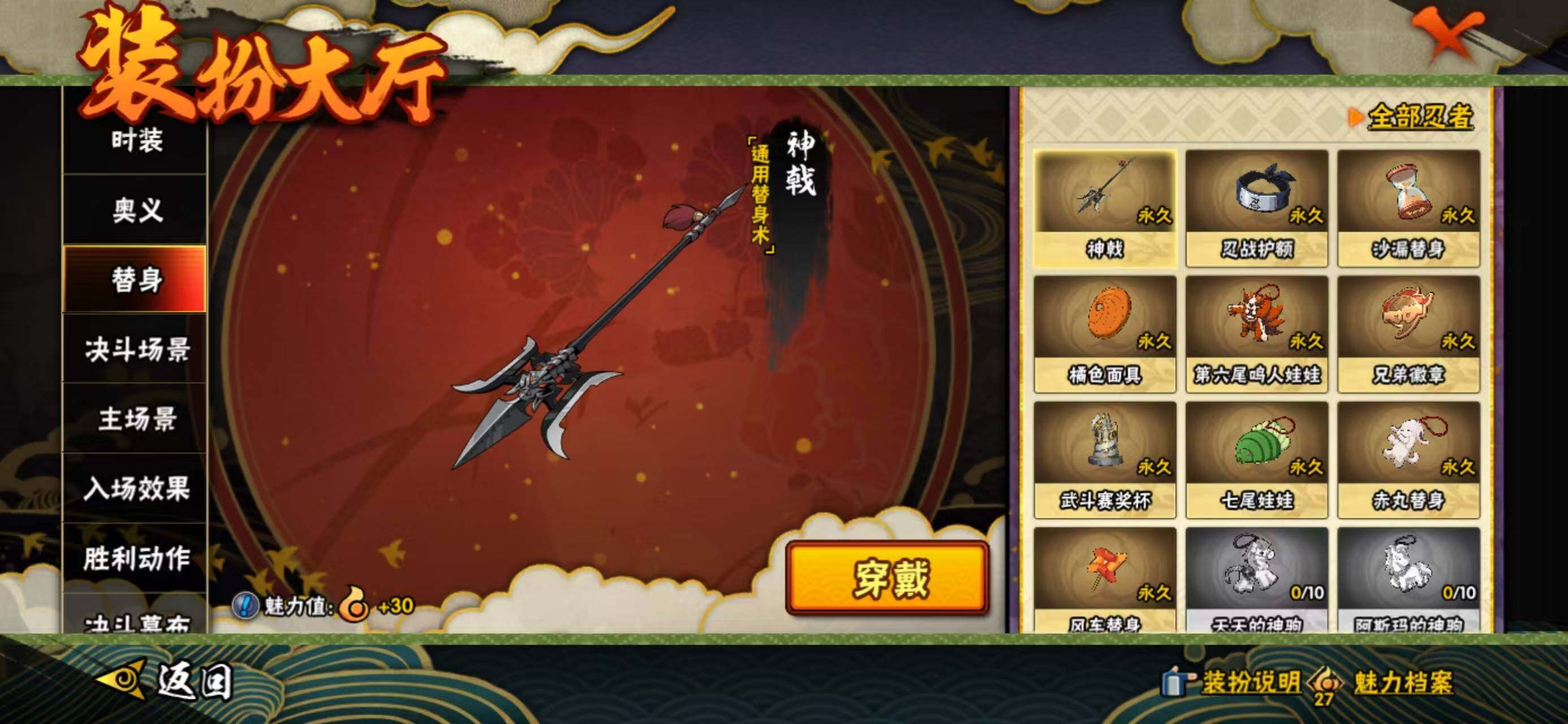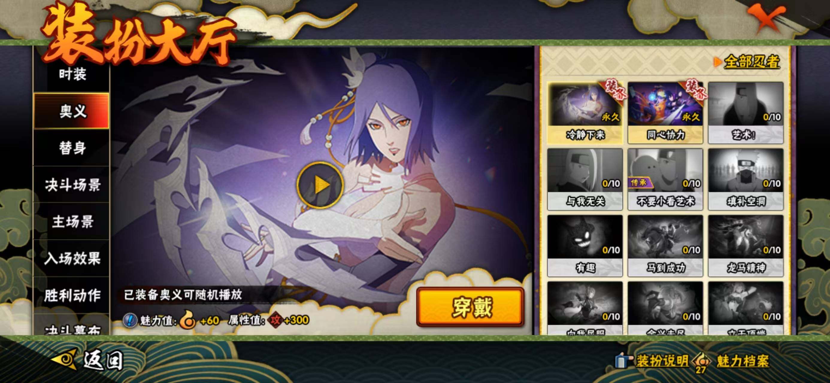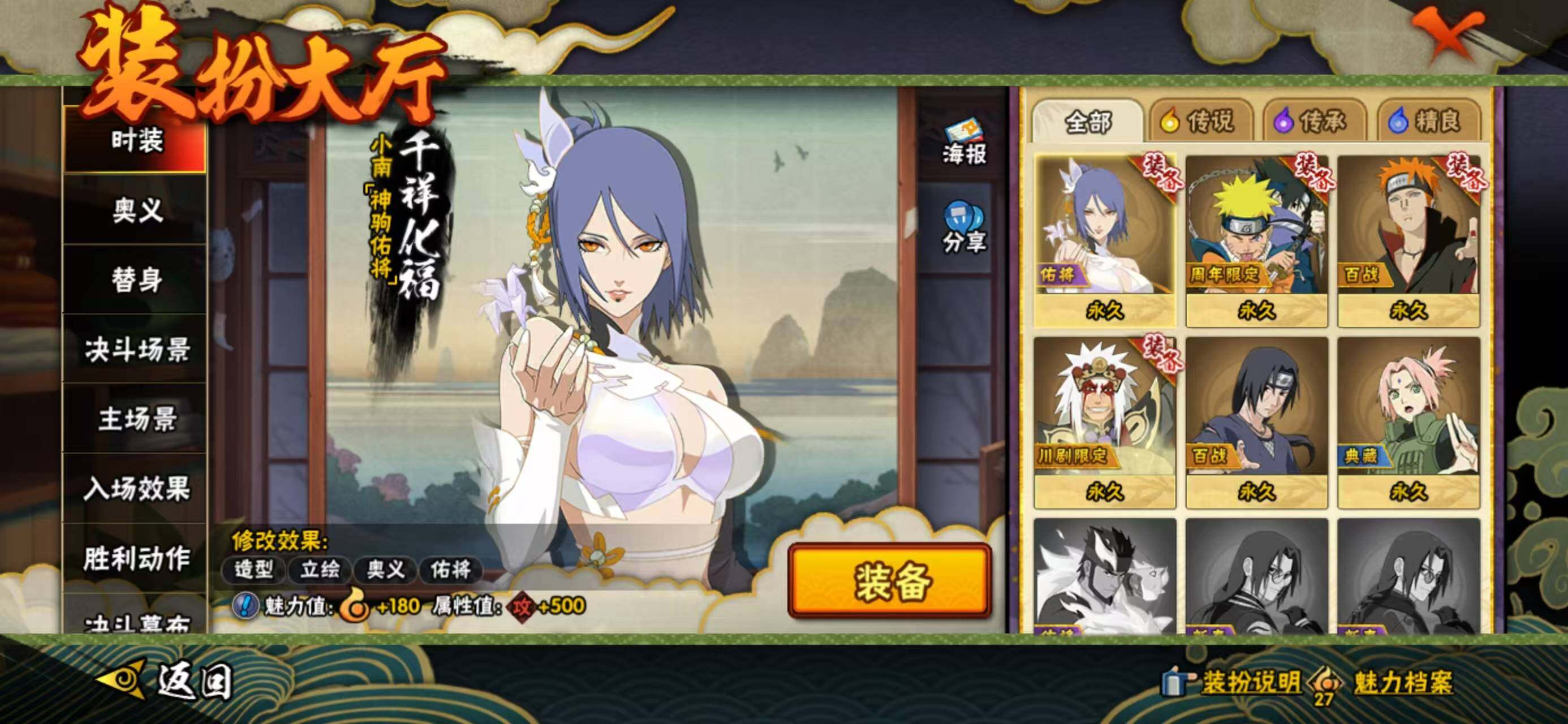 【S级忍者】:宇智波鼬「须佐能乎」(3星),旗木卡卡西「须佐能乎」(3星),自来也「舞之豪杰」(3星),自来也「传说中的三忍」(3星),佩恩「天道」(3星),漩涡鸣人·宇智波佐助(3星)