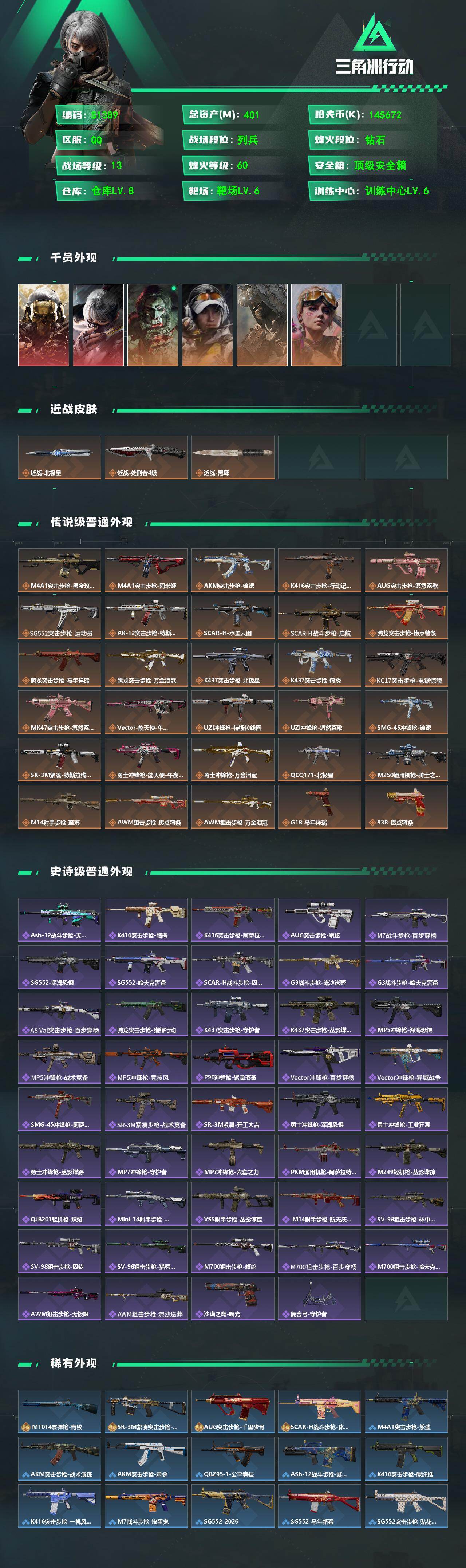 401m总资产-145672k哈夫币-60烽火等级-钻石-13战