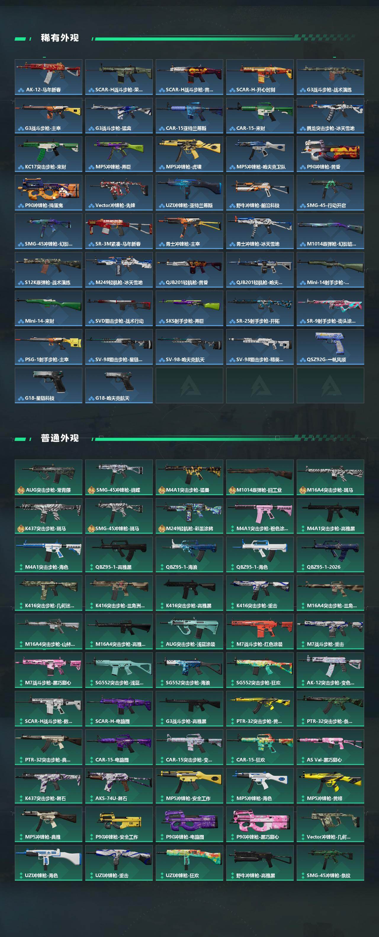 【传说外观】:M4A1突击步枪-蚀金玫瑰,M4A1突击步枪-阿米娅,AKM突击步枪-锦绣,K416突击步枪-行动记录,AUG突击步枪-悠然茶歇,SG552突击步枪-运动员,AK-12突击步枪-特斯拉线圈,SCAR-H战斗步枪-水墨云图,SC