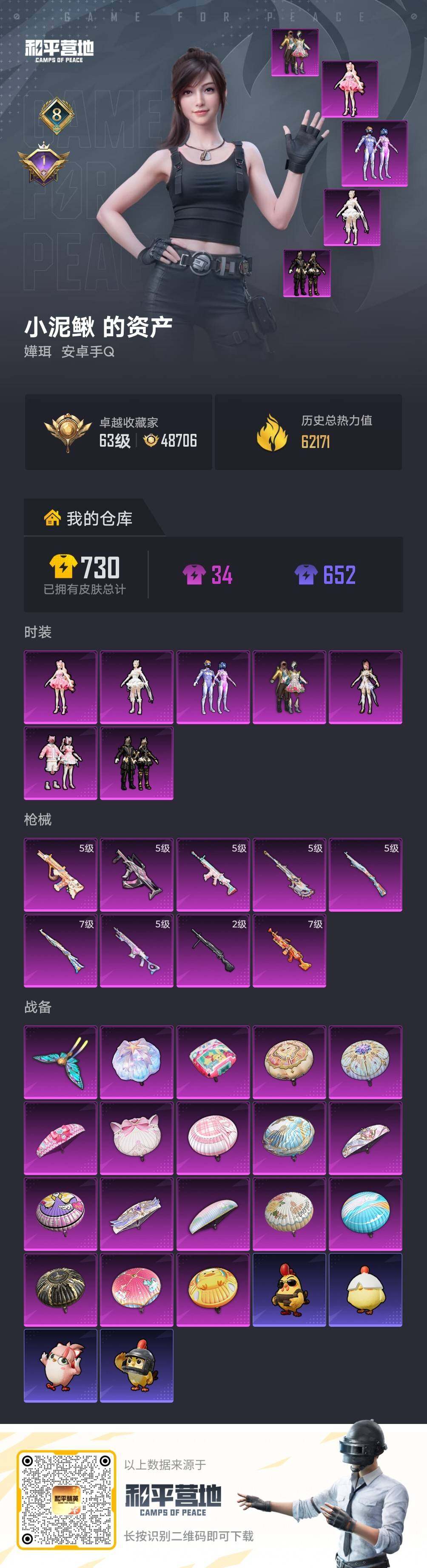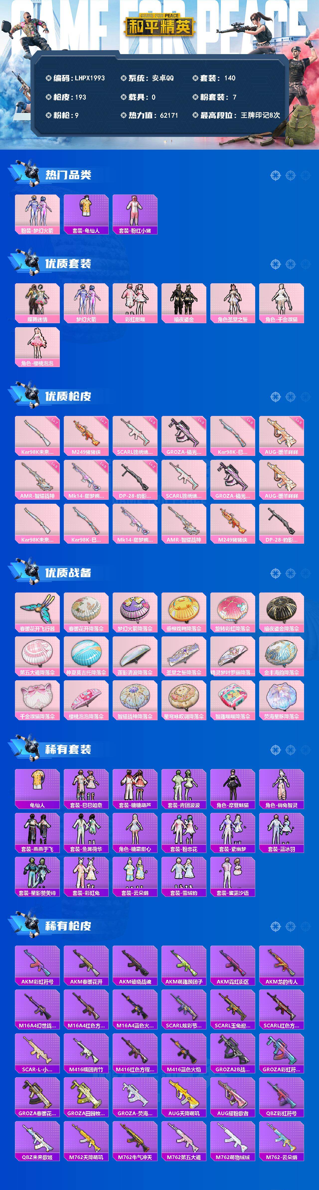 【特价出售/店主推荐】安卓 手Q-7粉装-9特效枪-1粉色飞行器-62171热力值-8王牌印记-140套装-193枪皮【热门品类】:粉装-梦幻火箭,套装-龟仙人,套装-粉红小猪【粉色套装】:粉装-蝶舞迷情,粉装-梦幻火箭,粉装-彩虹甜喵,粉装-暗夜鎏金,角色-圣堂之誓,角色-千金淑猫,角色-樱桃泡泡【粉色枪皮等级】:SCAR-L-锦绣绵绵(五级),GROZA-镜光银凌(五级),AUG-暖羊咩咩(