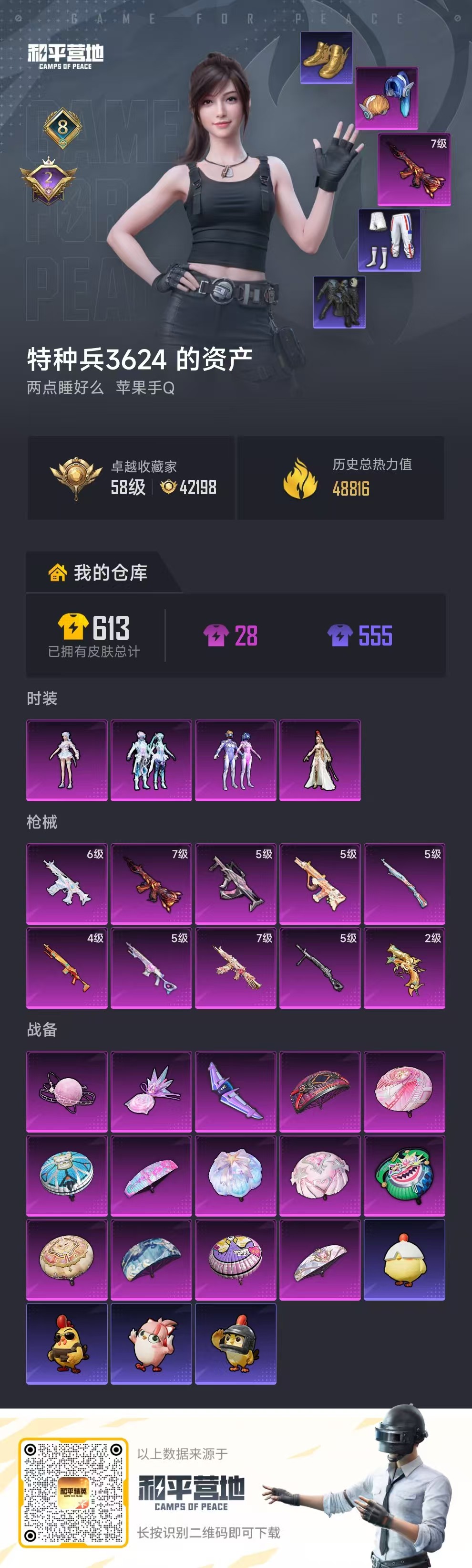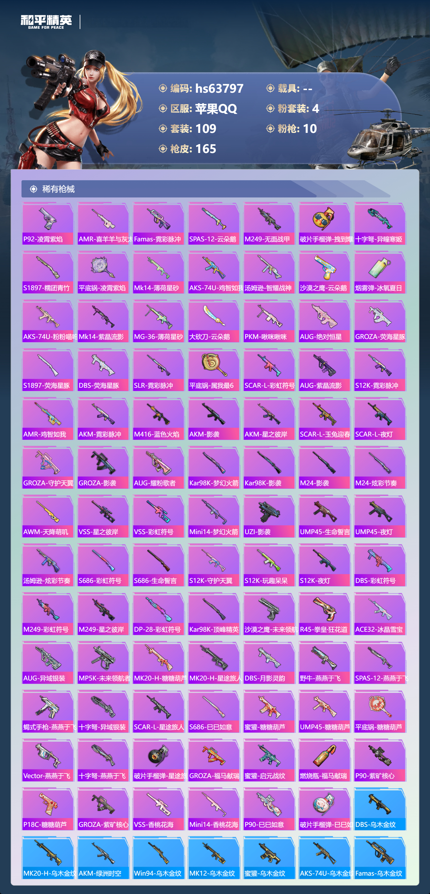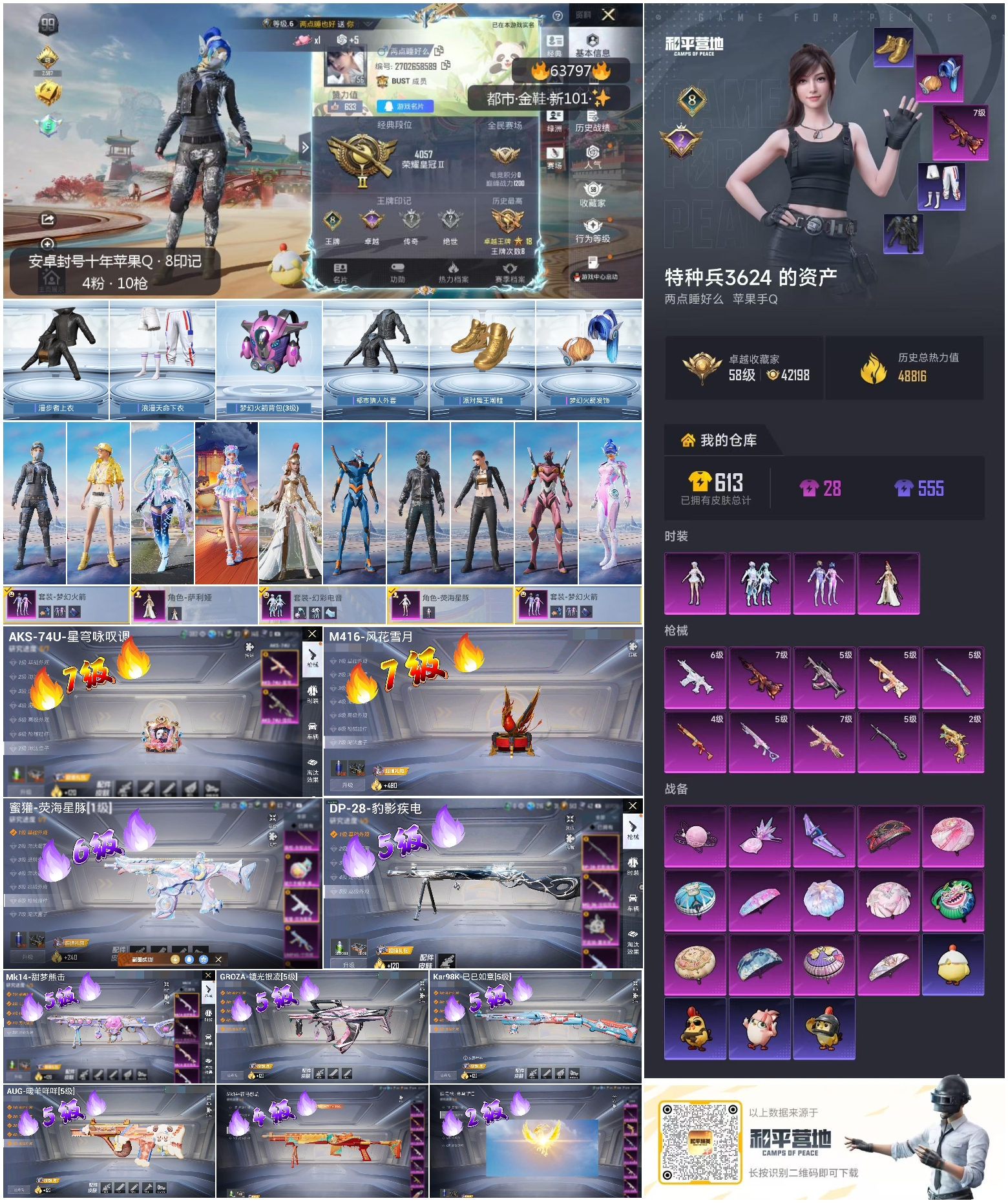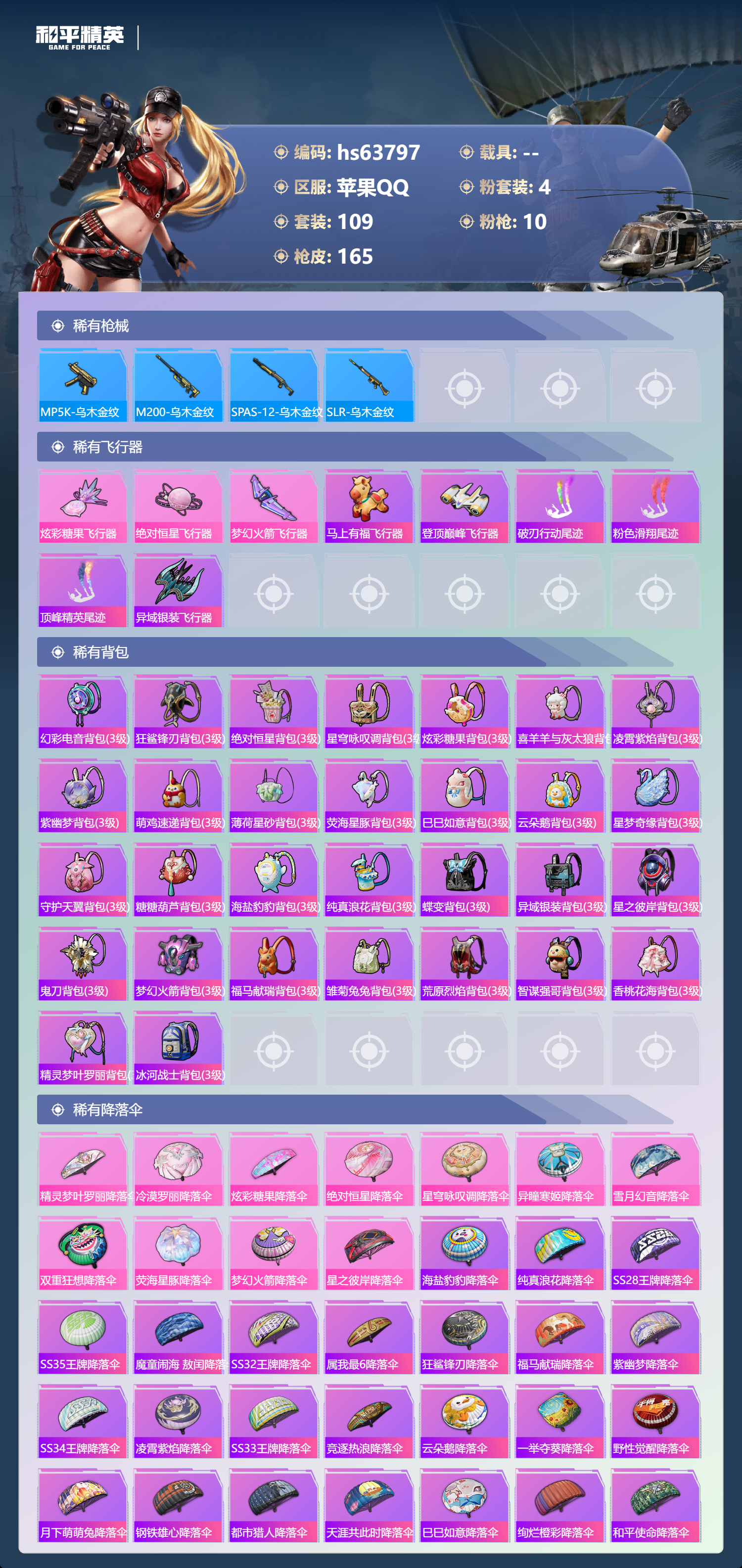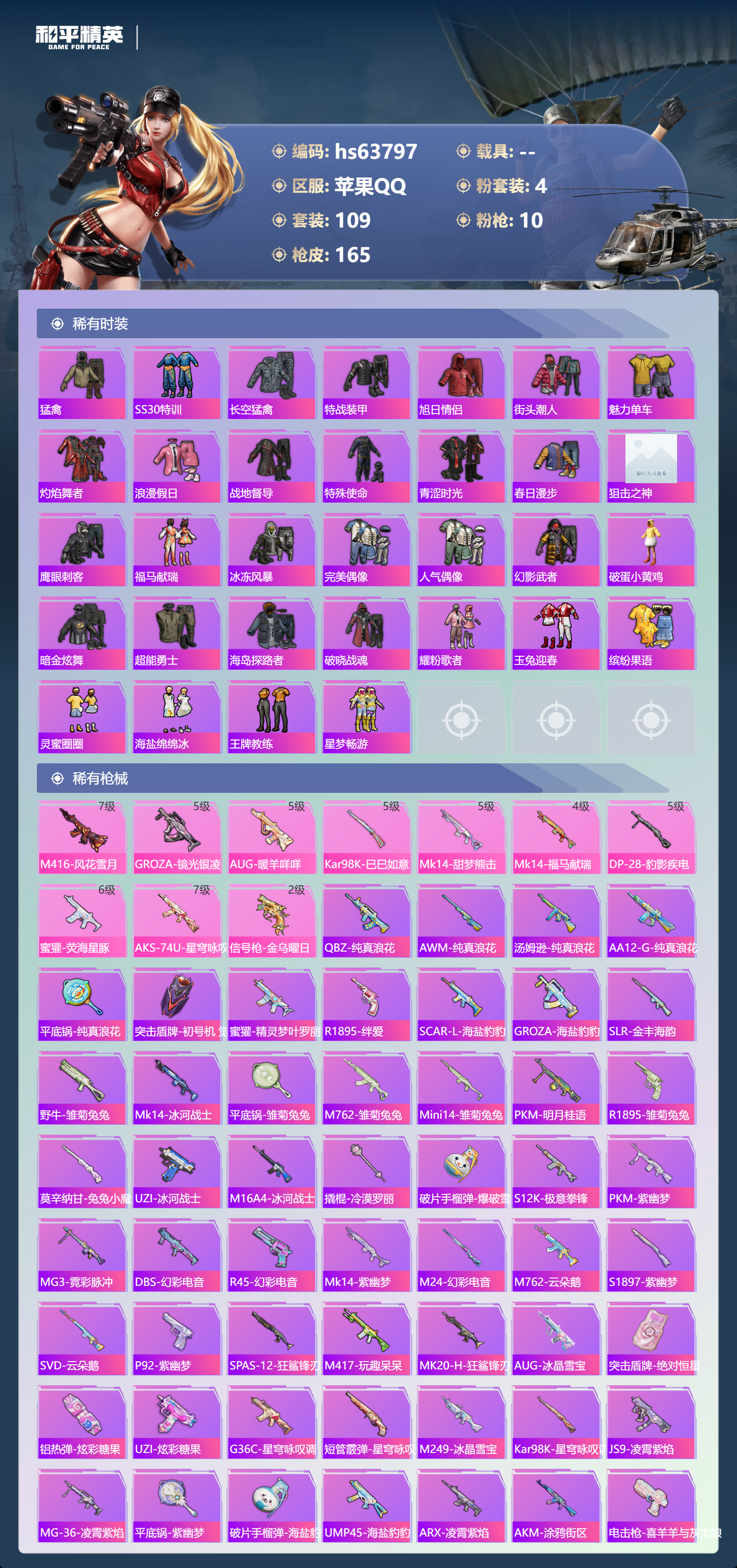 hs63797 苹果手Q-8王牌印记-4粉装-10特效枪-48816热力值-109套装-165枪皮-2卓越印记