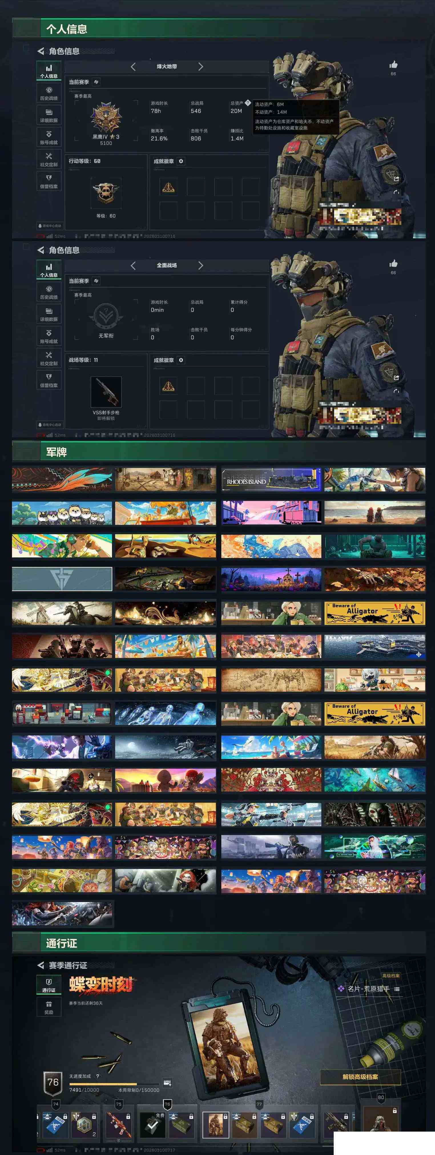 烽火地带段位: 黑鹰 全面战场段位: 列兵 总资产: 20000000 哈夫币: 713000