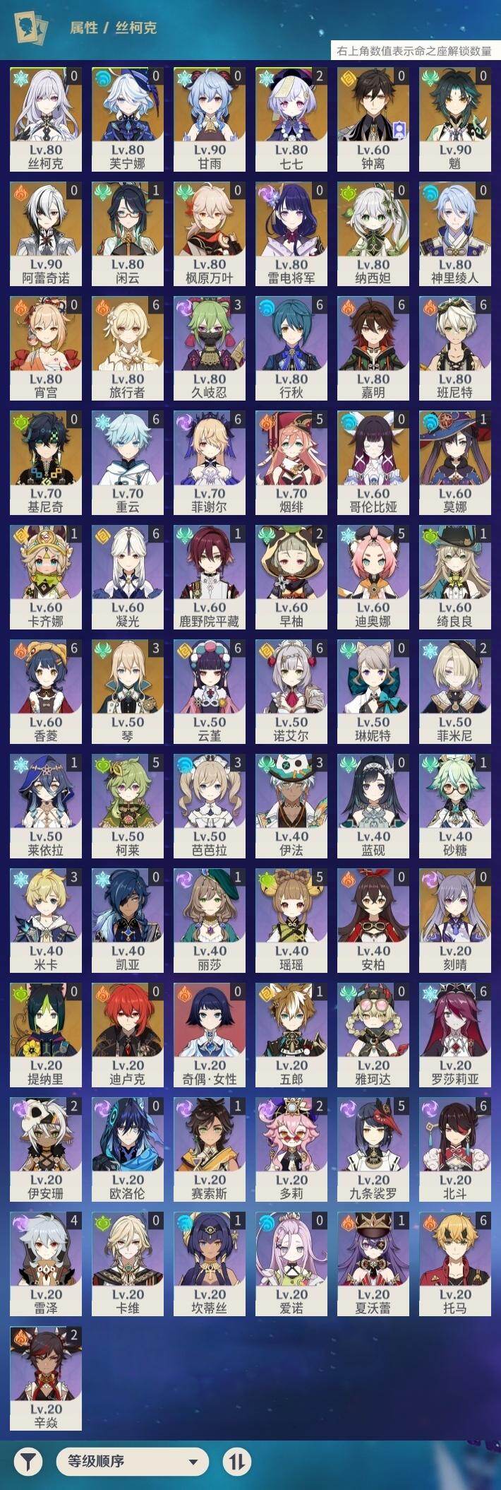 0命阿蕾奇诺,1命闲云,0命芙宁娜,0命纳西妲,0命提纳里,0命神里绫人,0命雷电将军,0命枫原万叶,0命钟离,0命甘雨,0命魈,0命宵宫,0命刻晴,2命七七,3命琴,1命莫娜,0命迪卢克,0命基尼奇,0命丝柯克,0命哥伦比娅,精1鹤鸣余音,精1金流监督,精1息灾,精2天空之脊,精1尘世之锁,精1风鹰剑,精1天空之傲