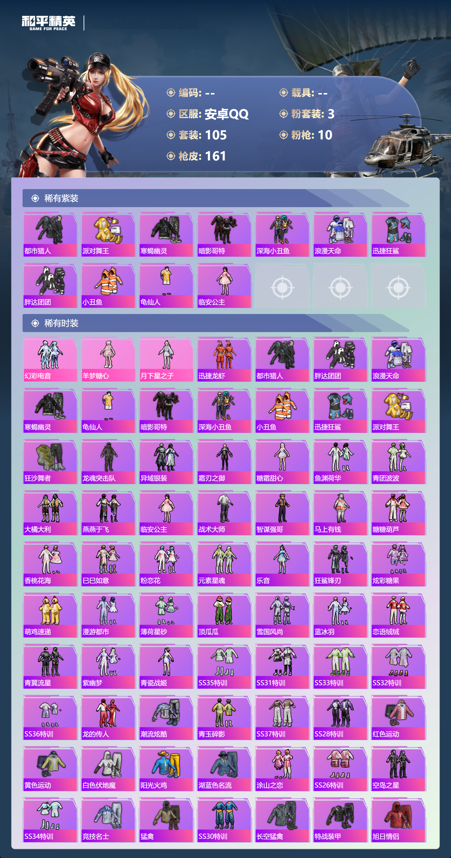 hs67140 安卓手Q-12王牌印记-3粉装-10特效枪-44769热力值-105套装-161枪皮-5卓越印记-1传奇印记
