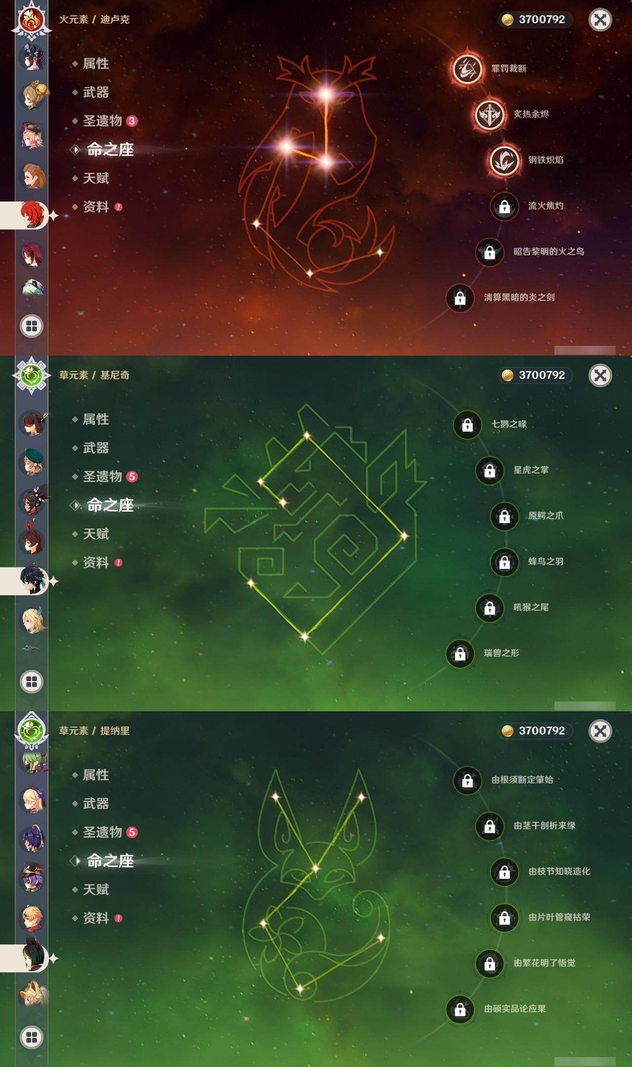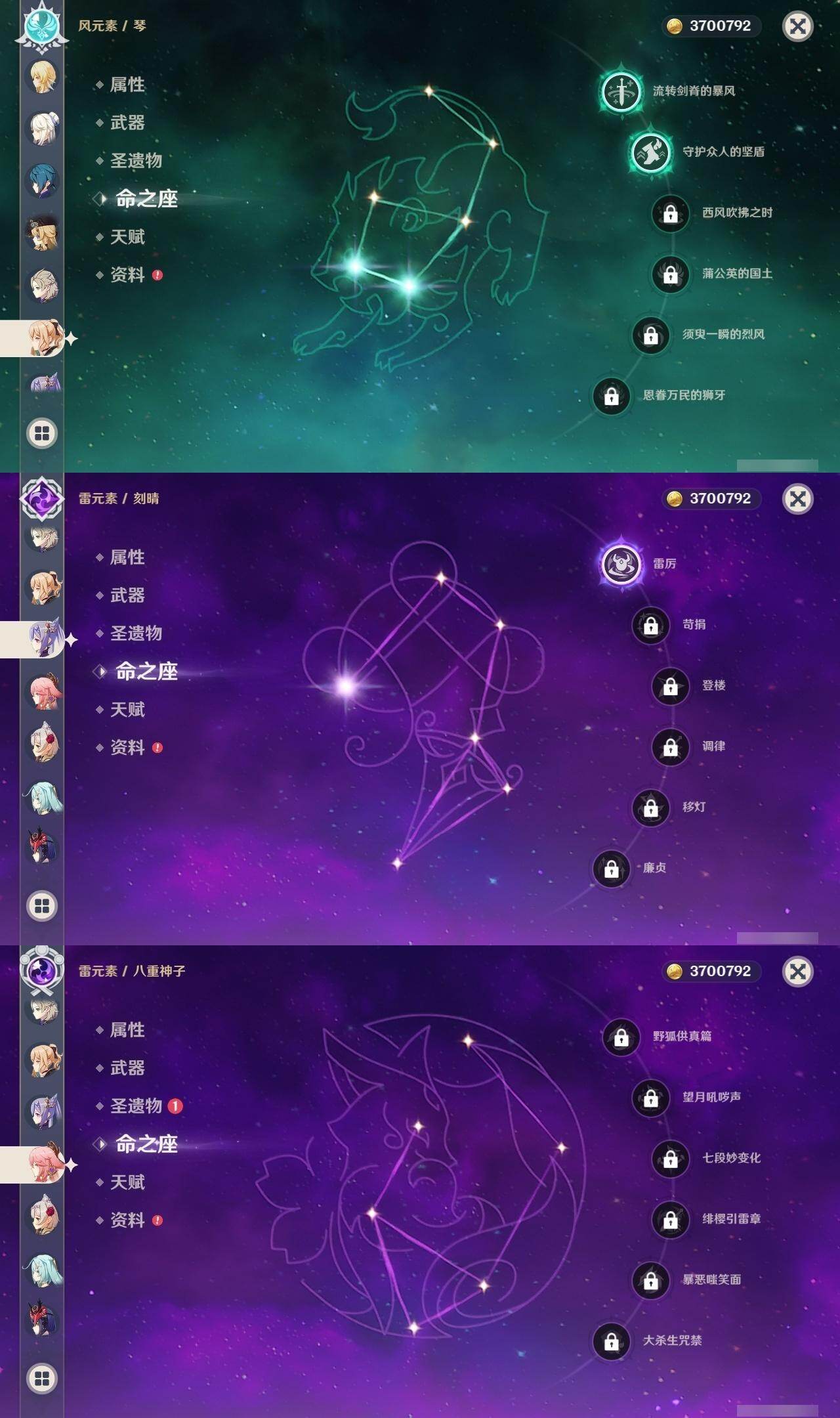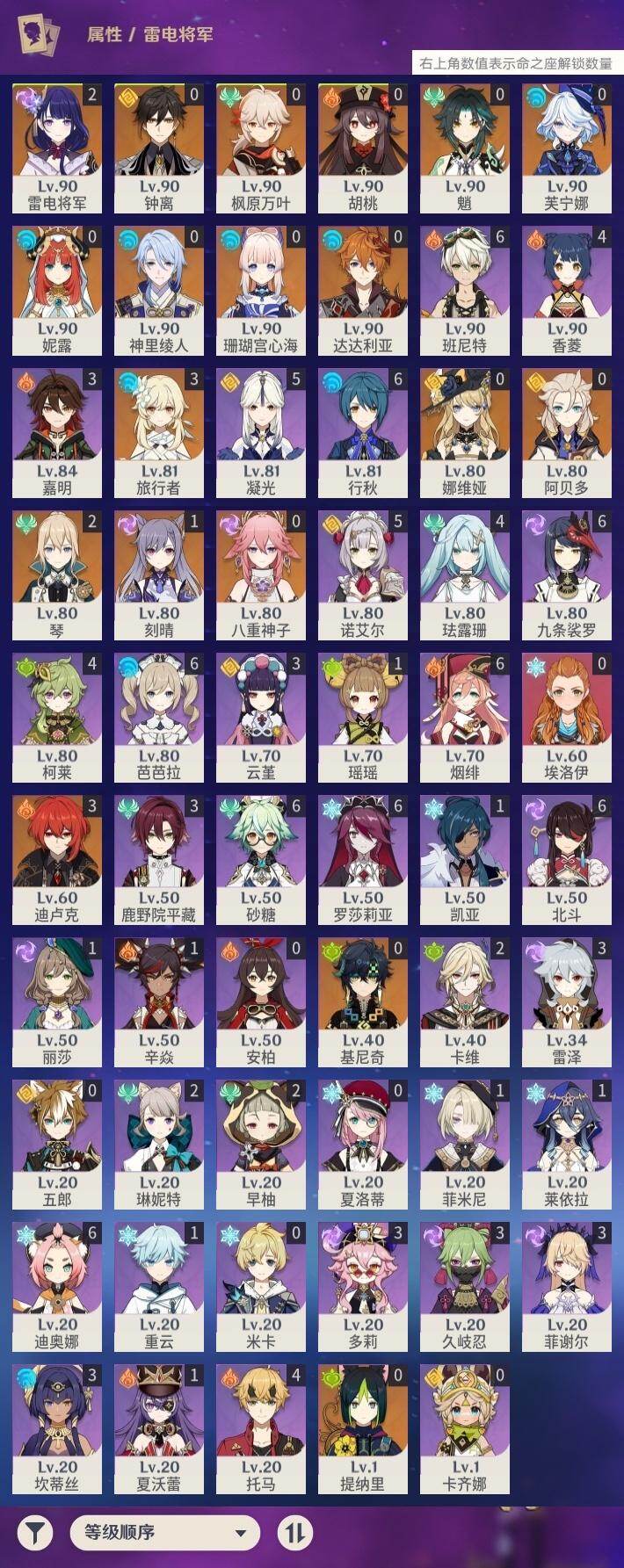 0命娜维娅,0命芙宁娜,0命妮露,0命提纳里,0命神里绫人,0命八重神子,2命雷电将军,0命枫原万叶,0命钟离,0命胡桃,0命魈,0命达达利亚,0命阿贝多,0命珊瑚宫心海,1命刻晴,2命琴,3命迪卢克,0命基尼奇,精1若水,精1磐岩结绿,精1和璞鸢,精1天空之脊,精1贯虹之槊,精1阿莫斯之弓,精1狼的末路
