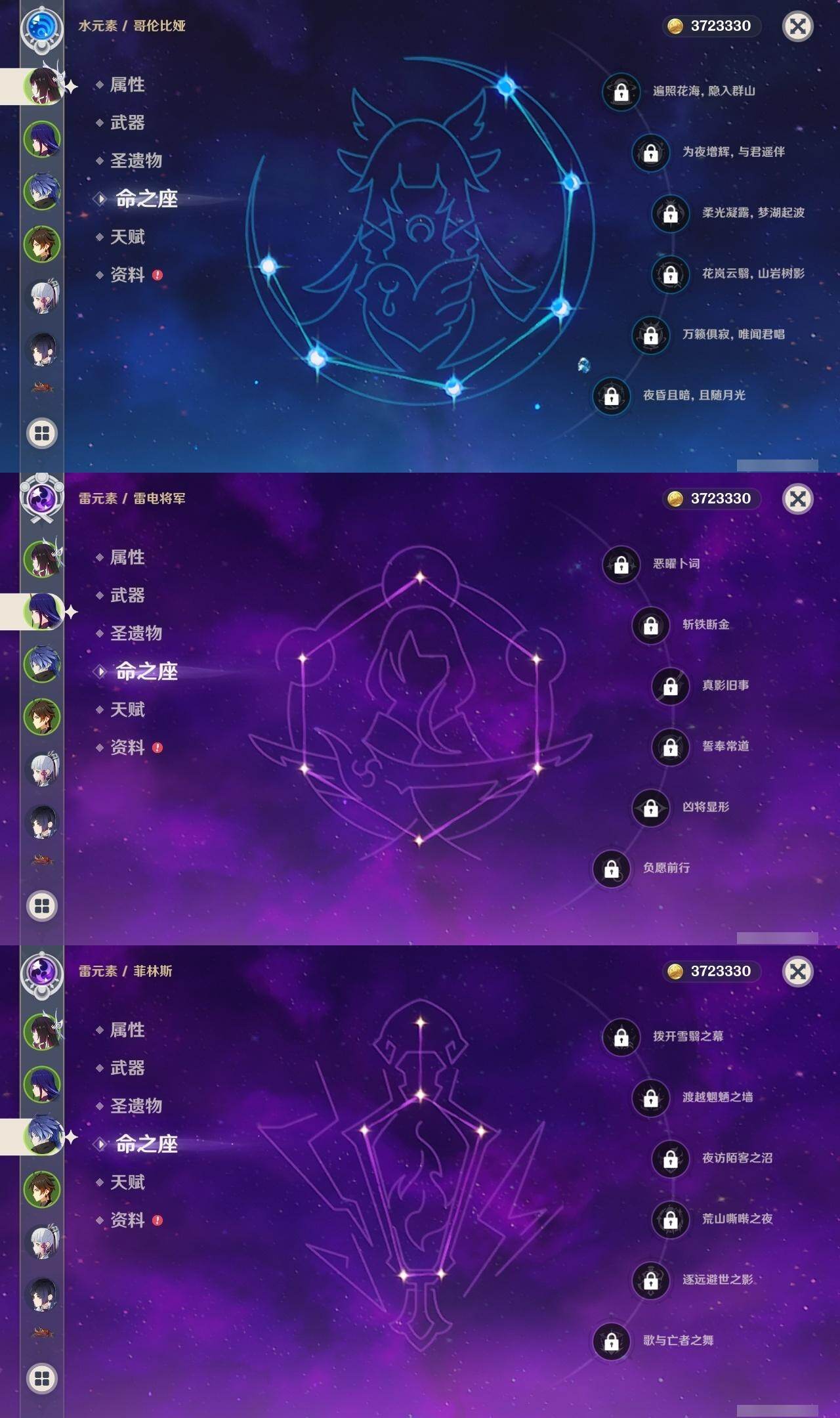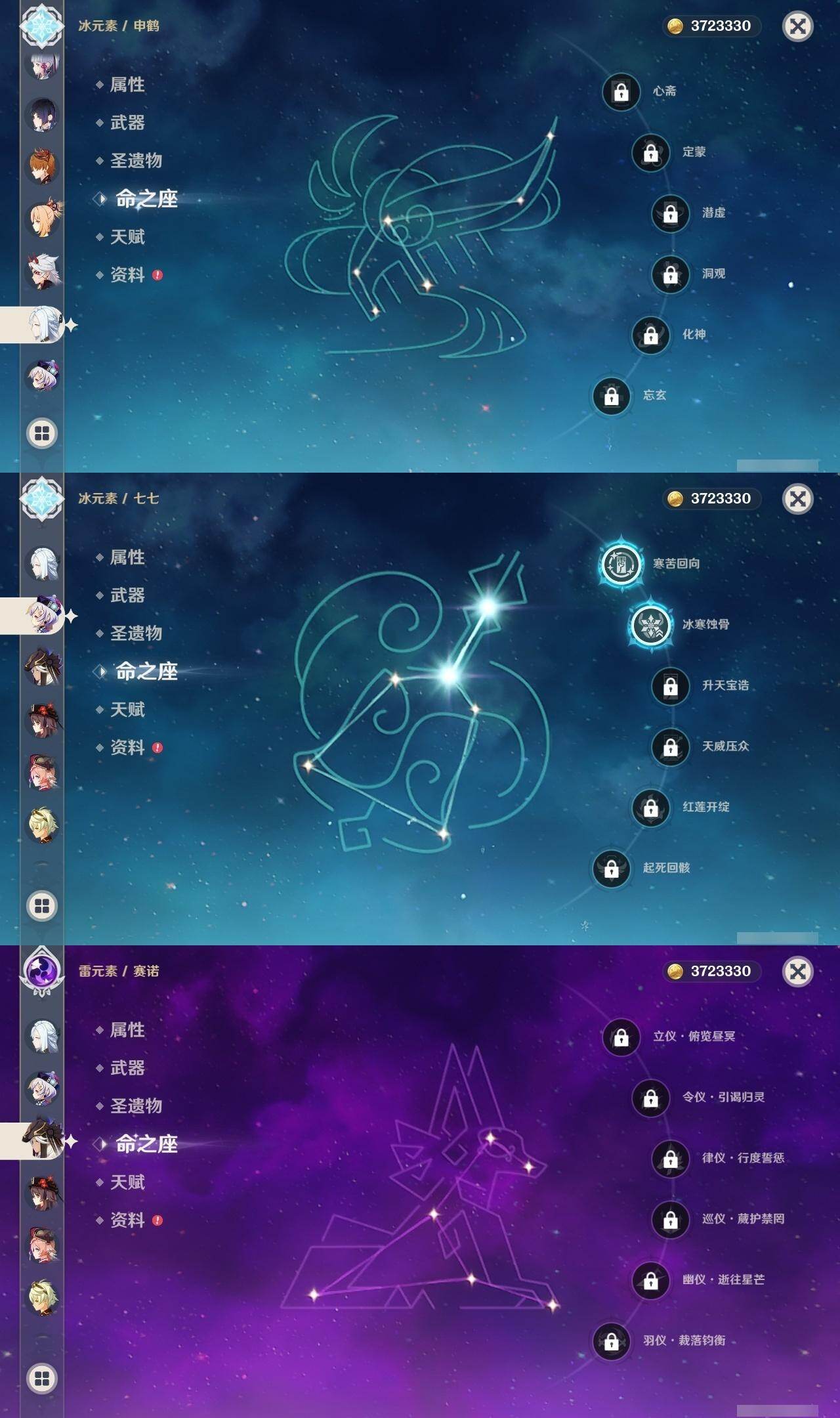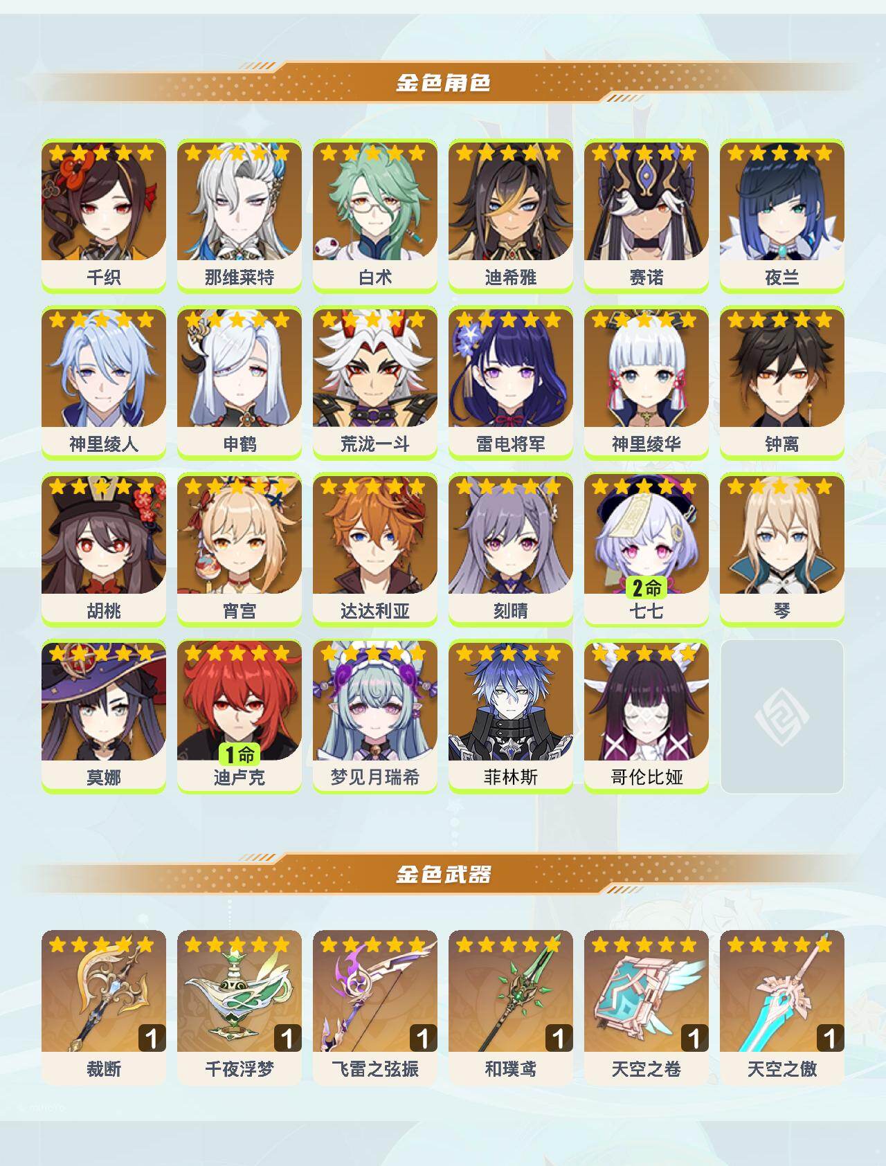 0命千织,0命那维莱特,0命白术,0命迪希雅,0命赛诺,0命夜兰,0命神里绫人,0命申鹤,0命荒泷一斗,0命雷电将军,0命神里绫华,0命钟离,0命胡桃,0命宵宫,0命达达利亚,0命刻晴,2命七七,0命琴,0命莫娜,1命迪卢克,0命梦见月瑞希,0命菲林斯,0命哥伦比娅,精1裁断,精1千夜浮梦,精1飞雷之弦振,精1和璞鸢,精1天空之卷,精1天空之傲