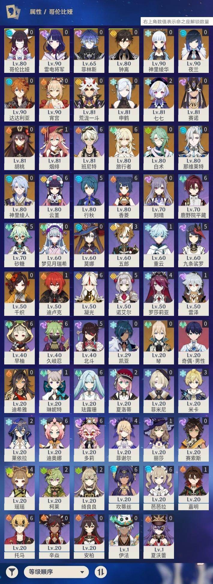 59级/33黄/女主/23个五星角色/7个五星武器