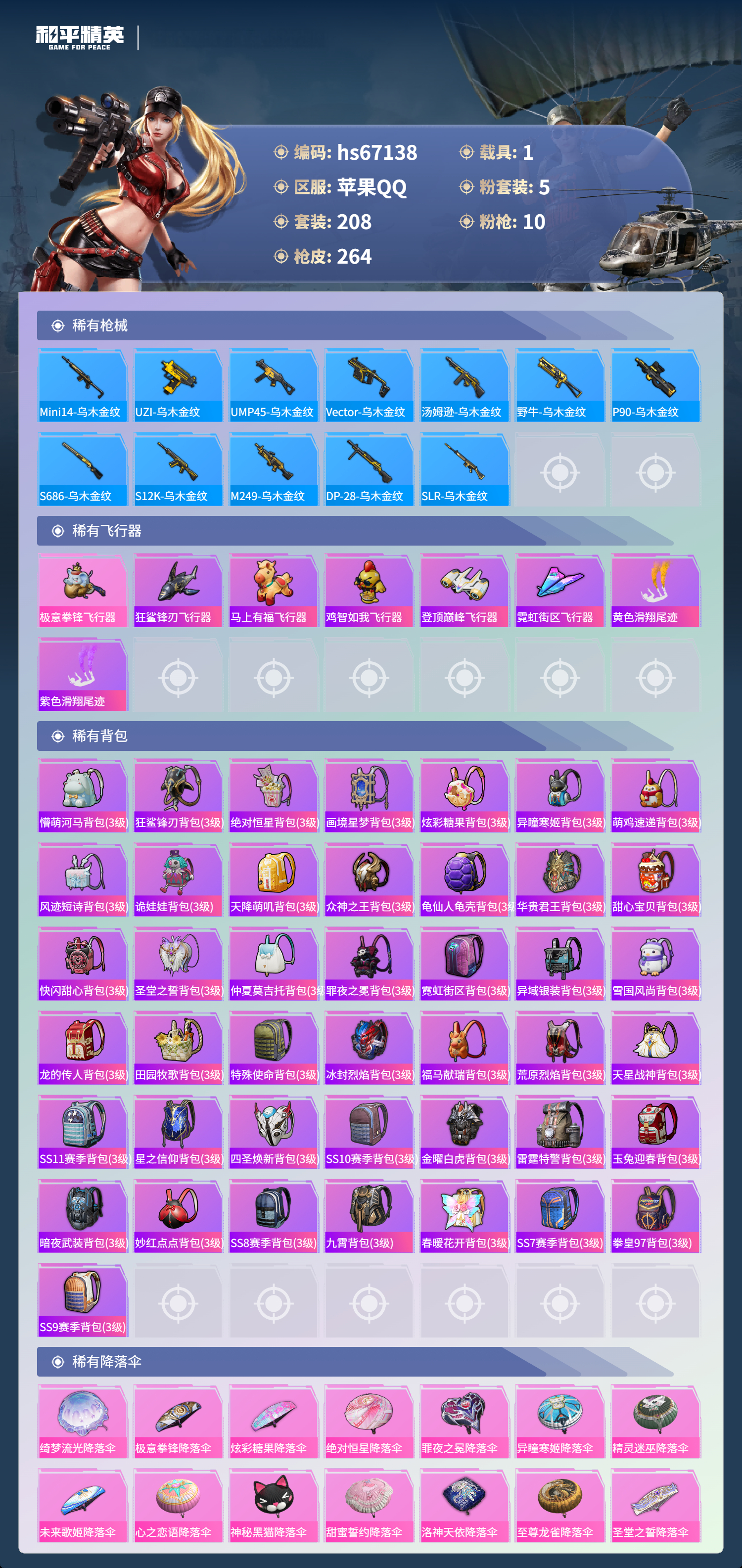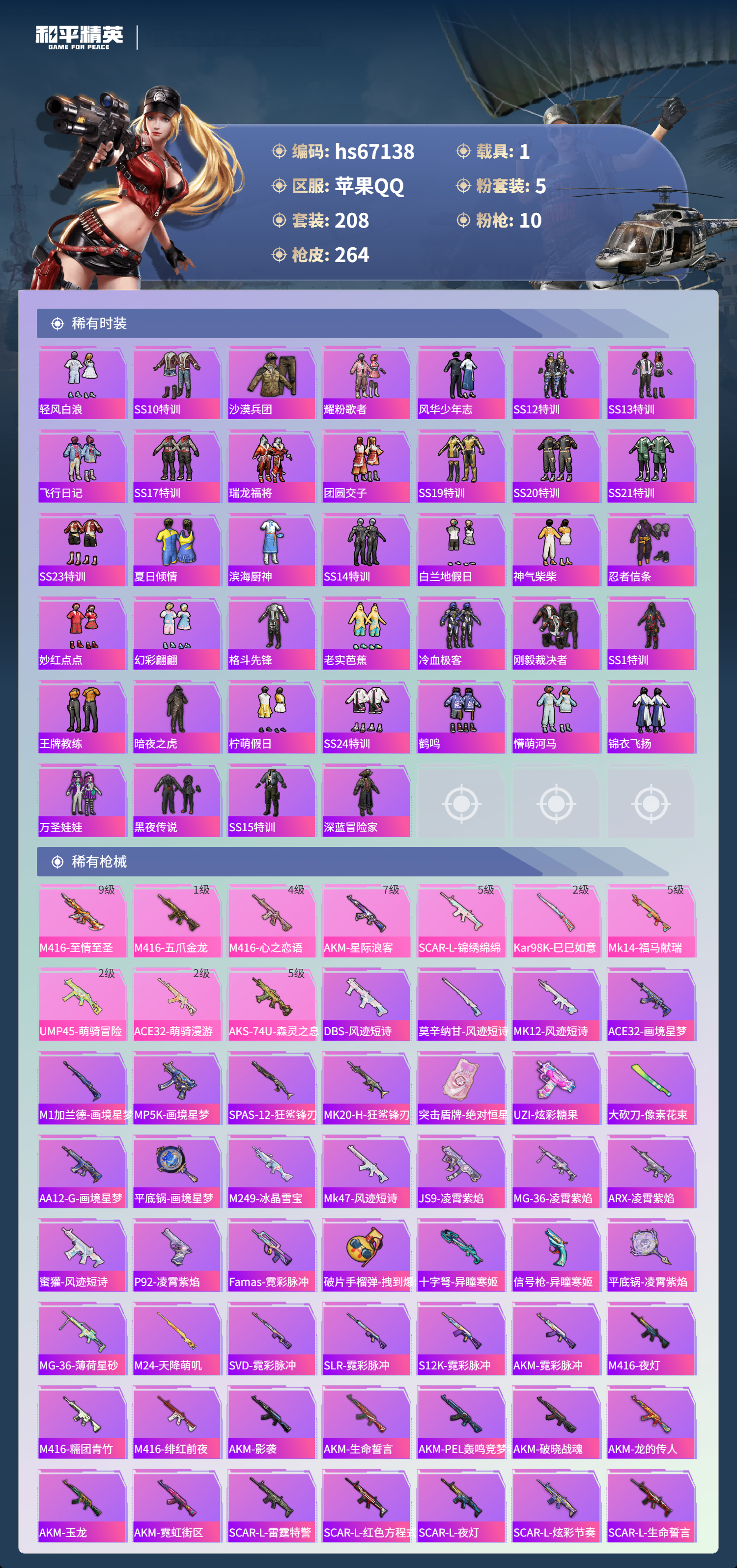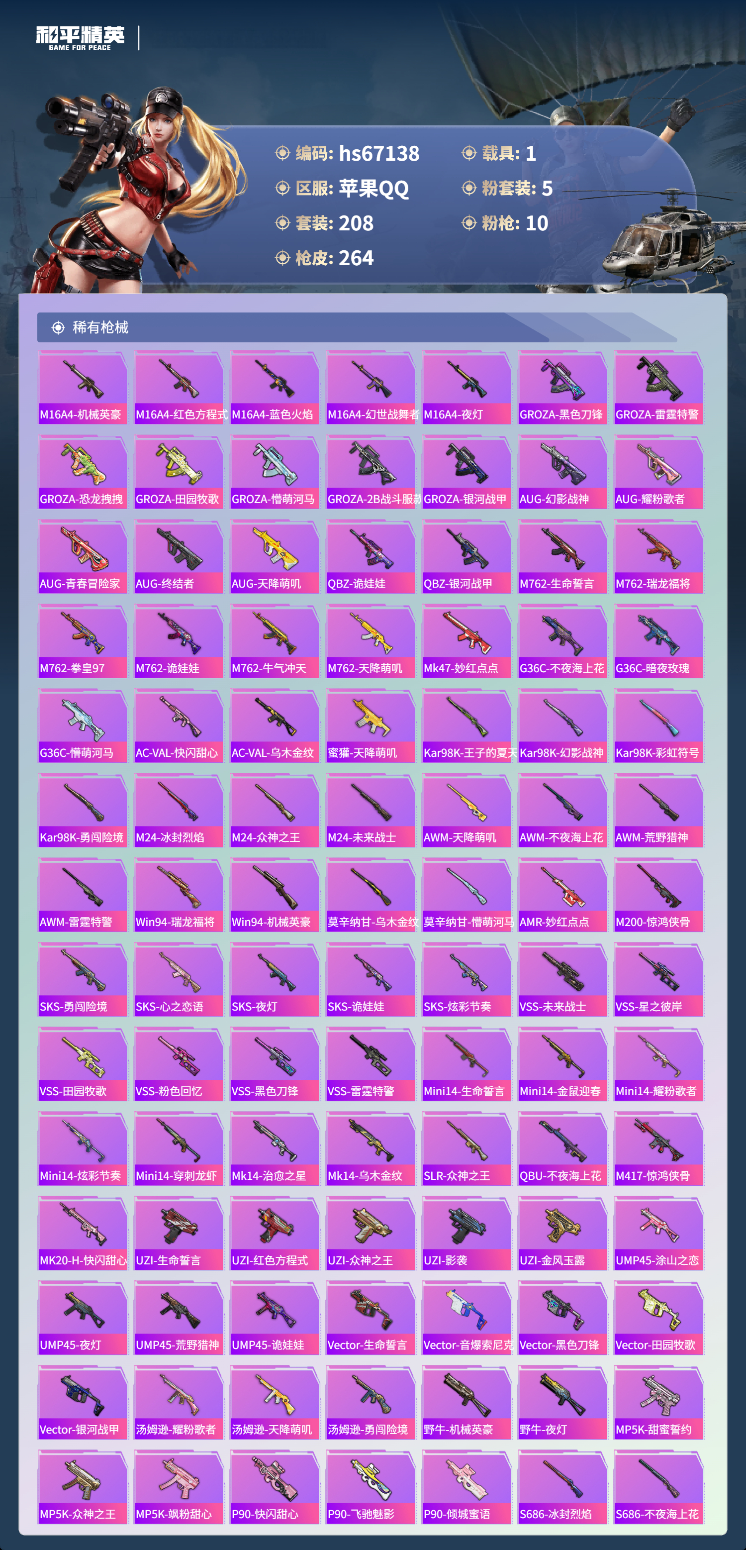 hs67138 苹果手Q-17王牌印记-5粉装-10特效枪-1载具-79062热力值-208套装-264枪皮-1卓越印记