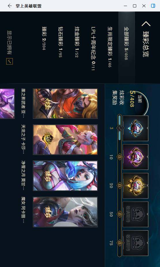 未定级段位-141英雄-416皮肤-41炫彩-1终极-3神话-77限定-28传说