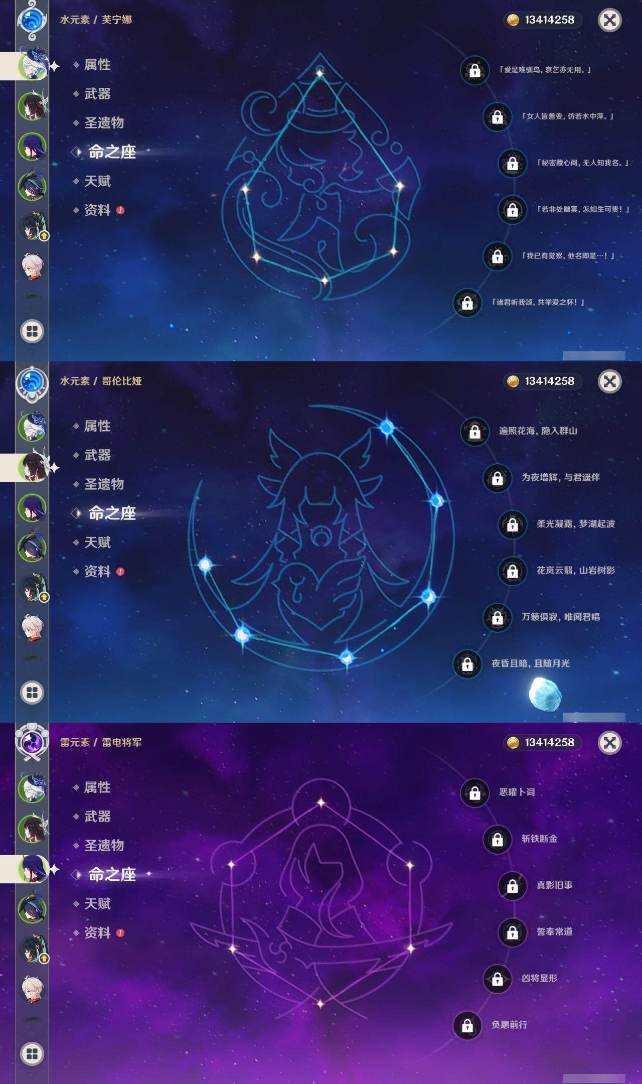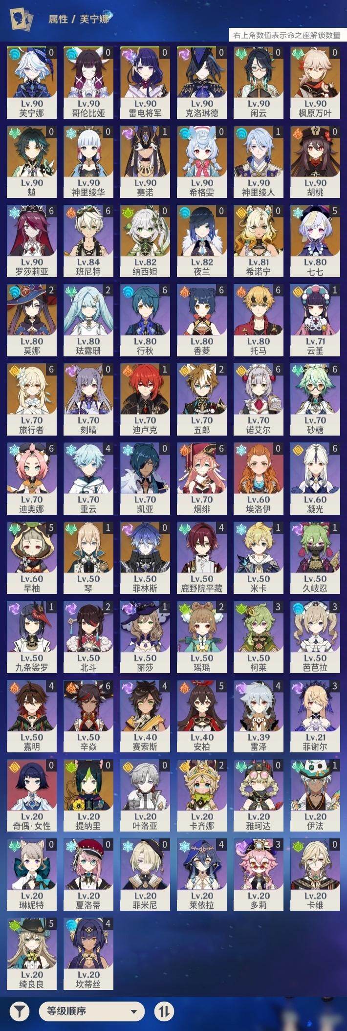 0命希格雯,0命克洛琳德,0命闲云,0命芙宁娜,0命纳西妲,1命赛诺,0命提纳里,0命夜兰,1命神里绫人,0命雷电将军,0命枫原万叶,0命神里绫华,0命胡桃,0命魈,0命刻晴,5命七七,1命琴,2命莫娜,1命迪卢克,0命希诺宁,0命菲林斯,0命哥伦比娅,精1赦罪,精1护摩之杖,精1磐岩结绿,精1天空之翼,精1阿莫斯之弓,精2天空之傲,精1柔灯挽歌,精1帷间夜曲