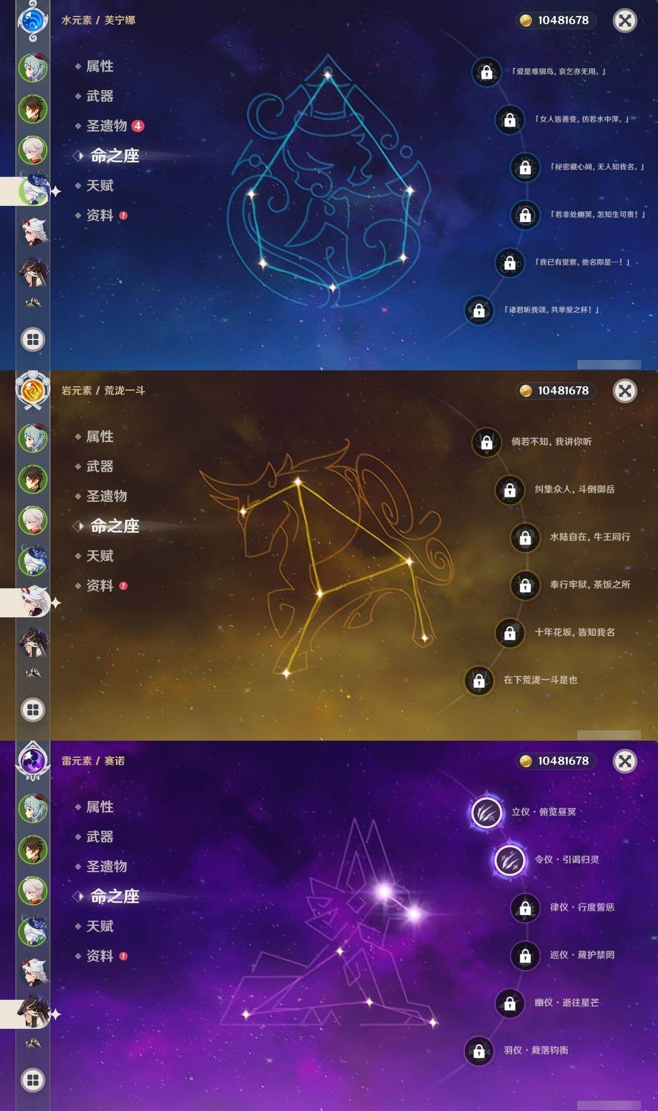 0命芙宁娜,0命林尼,0命艾尔海森,0命妮露,2命赛诺,1命提纳里,0命八重神子,0命荒泷一斗,0命雷电将军,0命枫原万叶,0命钟离,0命胡桃,1命甘雨,0命魈,0命温迪,0命珊瑚宫心海,2命刻晴,0命七七,3命琴,1命莫娜,1命迪卢克,精2赤沙之杖,精1圣显之钥,精1猎人之径,精1终末嗟叹之诗,精1护摩之杖,精1和璞鸢,精1天空之脊,精1贯虹之槊,精1阿莫斯之弓,精1狼的末路