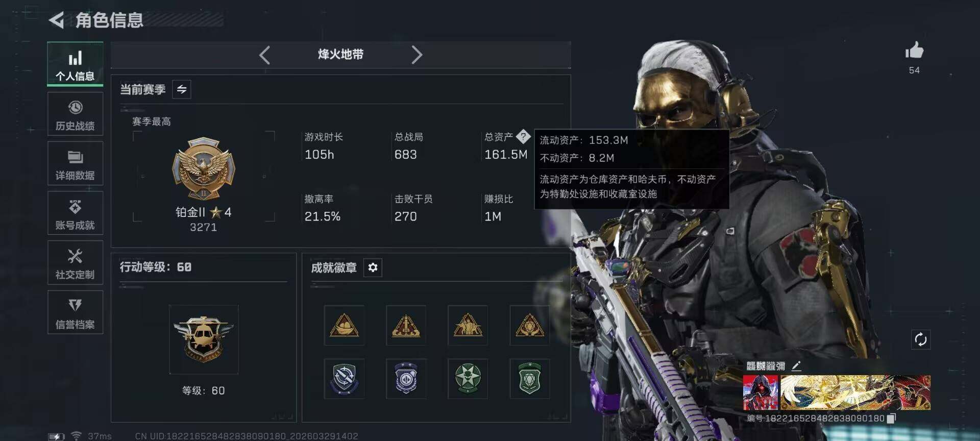161m总资产-282k哈夫币-60烽火等级-铂金-11战场等级-列兵
