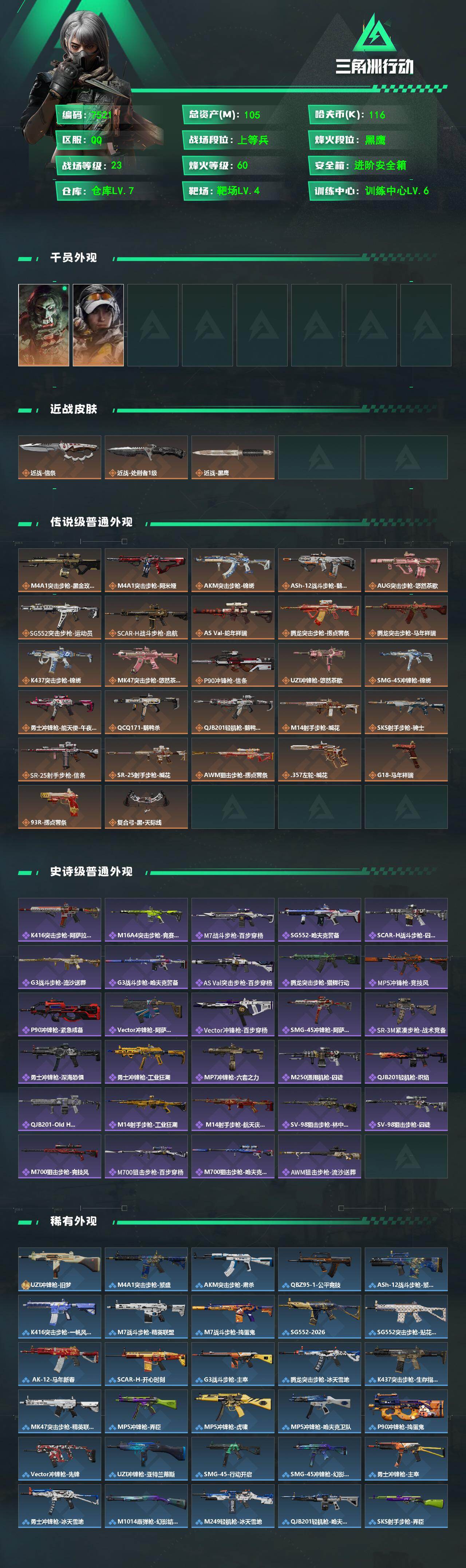 {特价出售}等级:60总资产:105.8M 纯币116988 隐藏挂饰:余烬之影 红皮:露娜-金牌射手/红狼-电锯惊魂 刀皮:近战-信条/近战-处刑者 砖皮: 特勤处:仓库7,训练6,靶场4