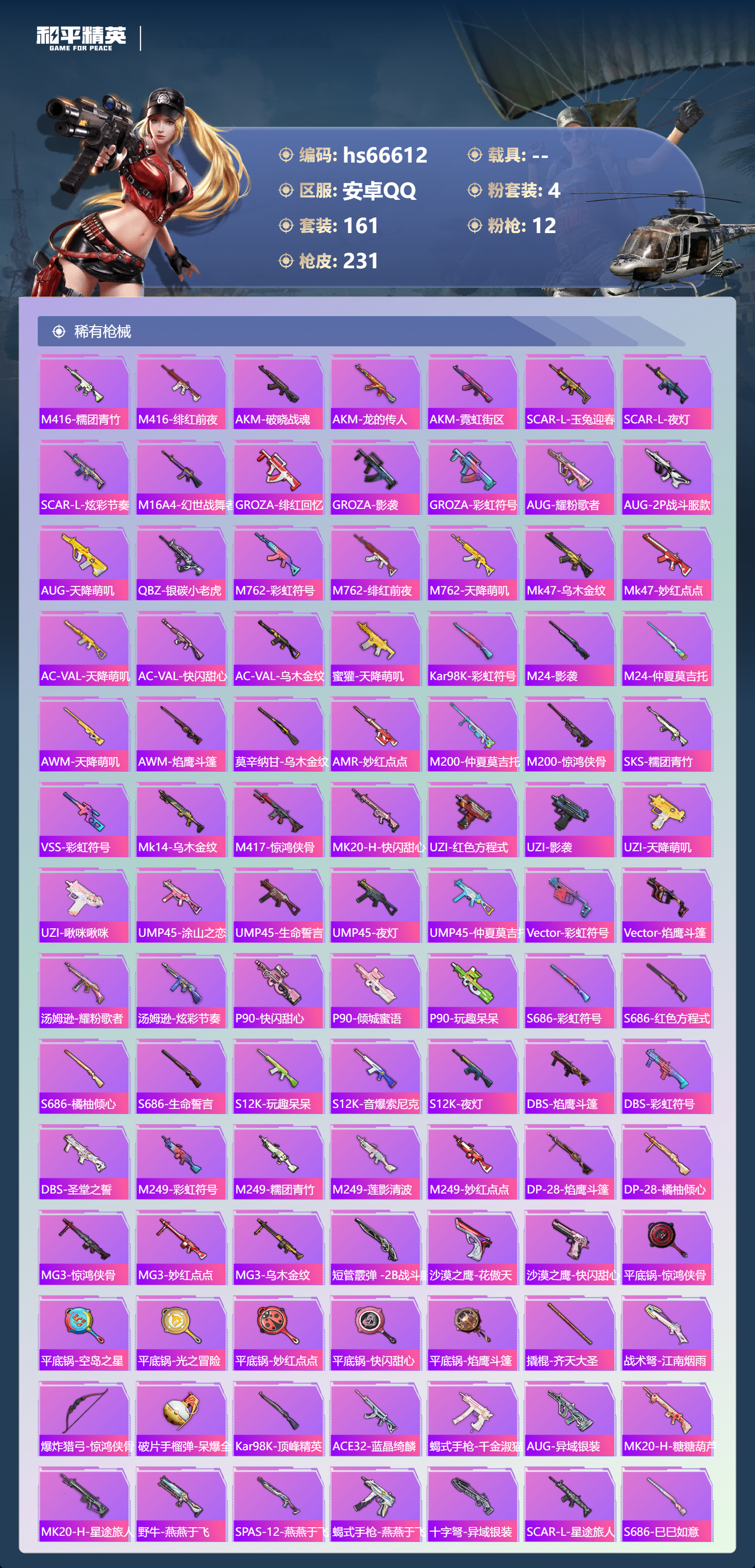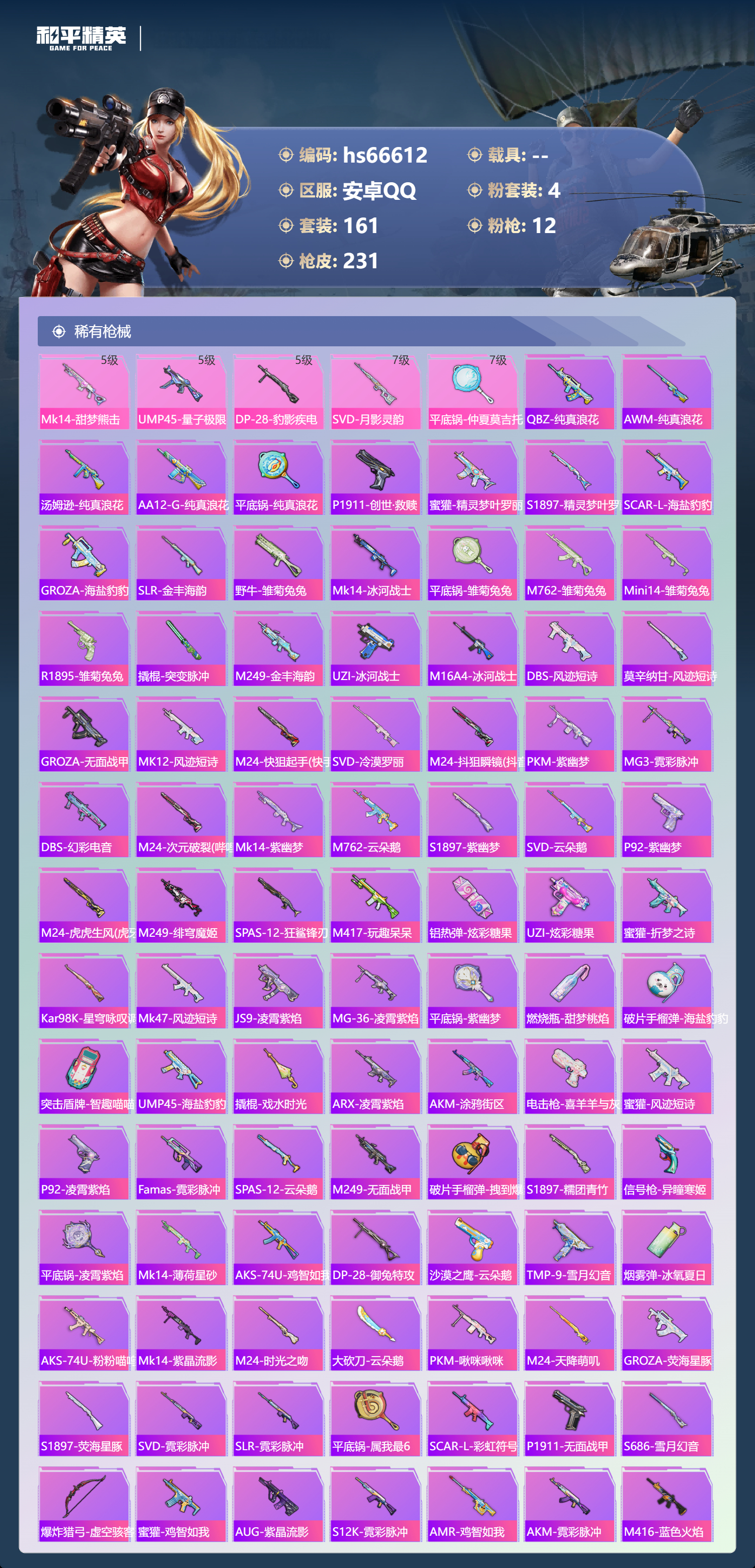 hs66612 安卓手Q-13王牌印记-4粉装-12特效枪-67556热力值-161套装-231枪皮-6卓越印记