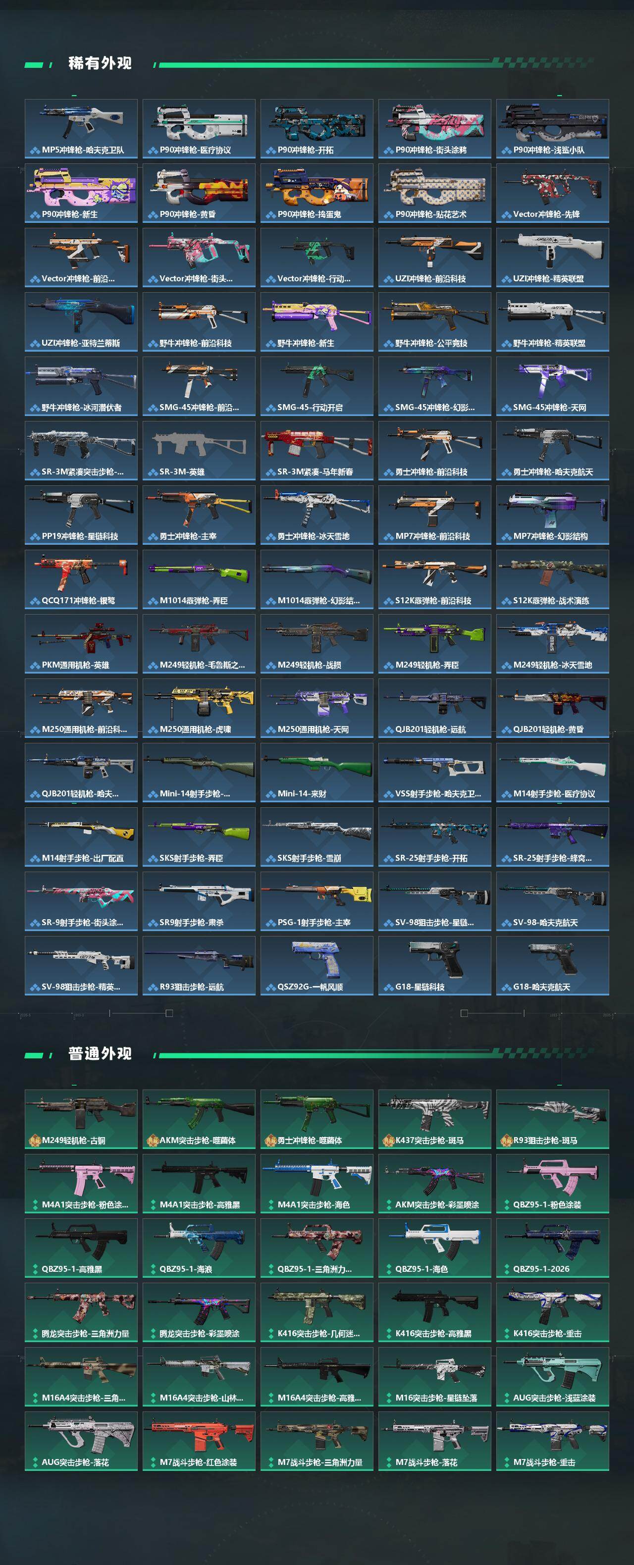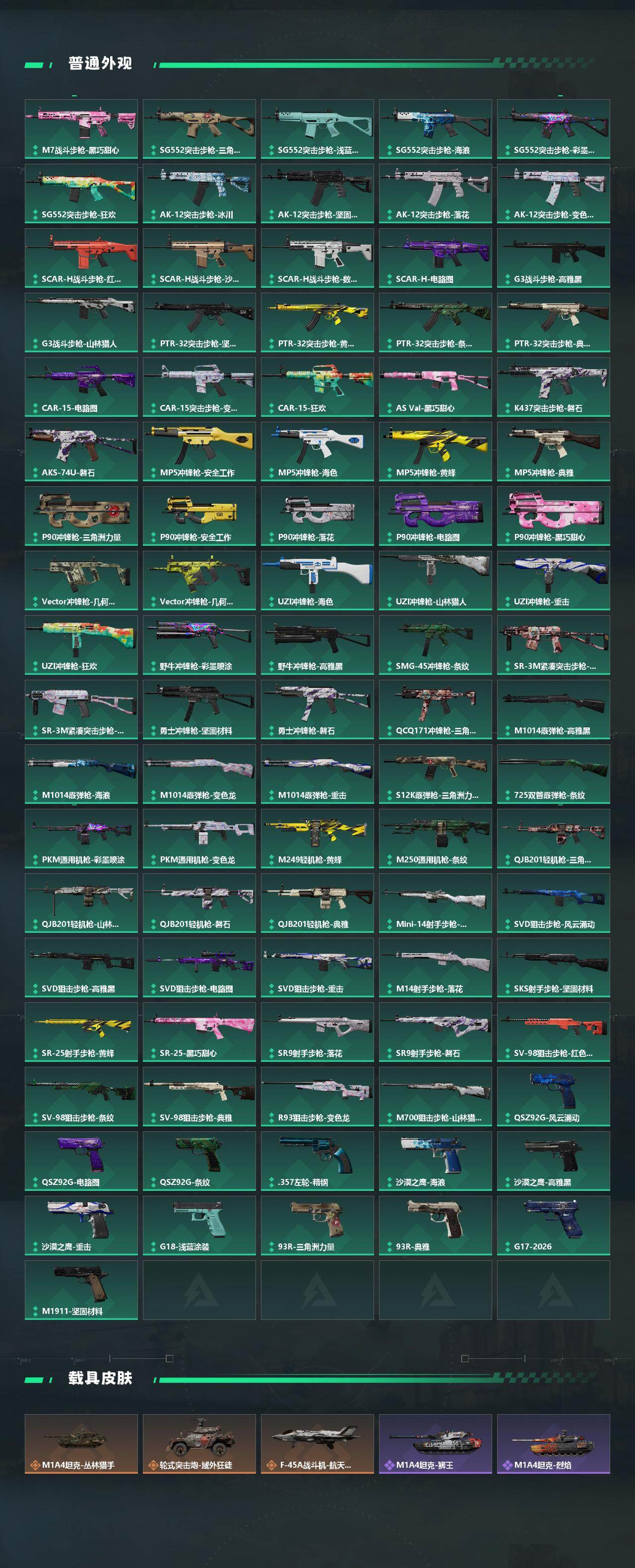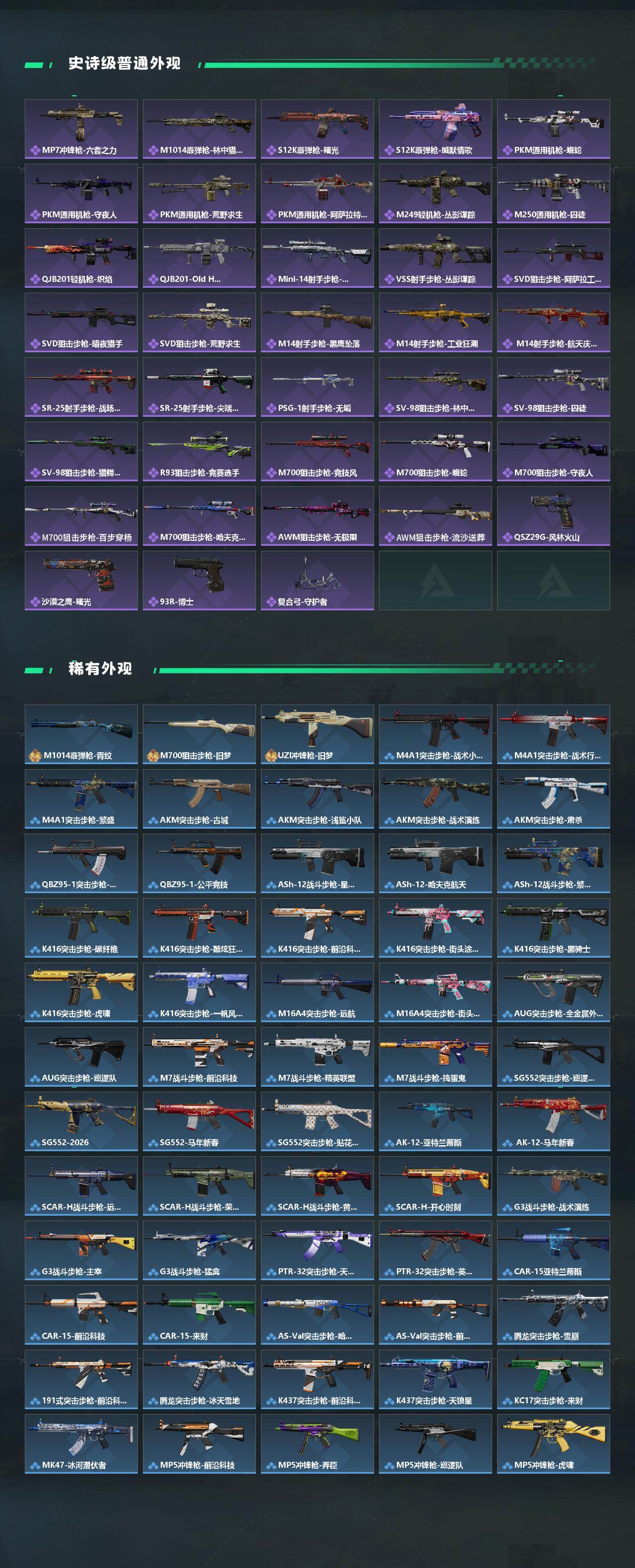 【传说外观】:M4A1突击步枪-阿米娅,ASh-12战斗步枪-鹅鸭杀,K416突击步枪-行动记录,AUG突击步枪-悠然茶歇,M7战斗步枪-神秘艺术,SG552突击步枪-运动员,AK-12突击步枪-夜