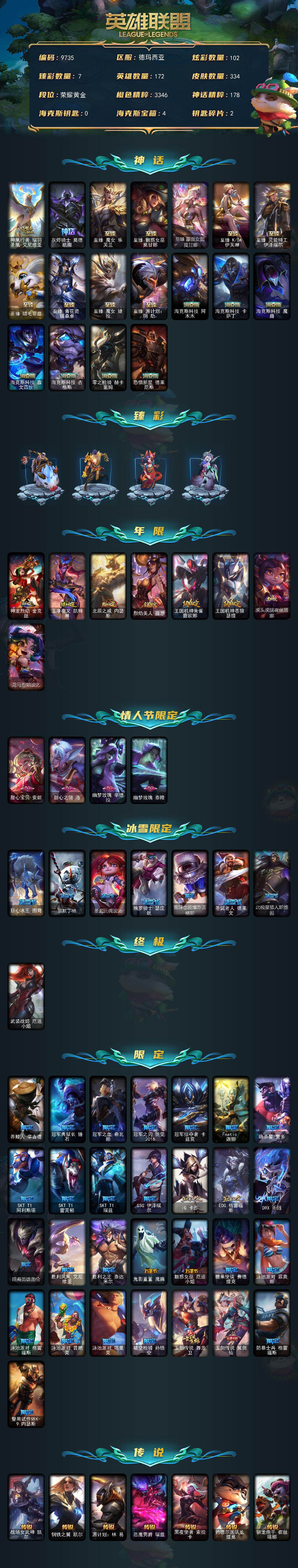 黄金段位-172英雄-334皮肤-102炫彩-1终极-18神话-48限定-42传说-53史诗