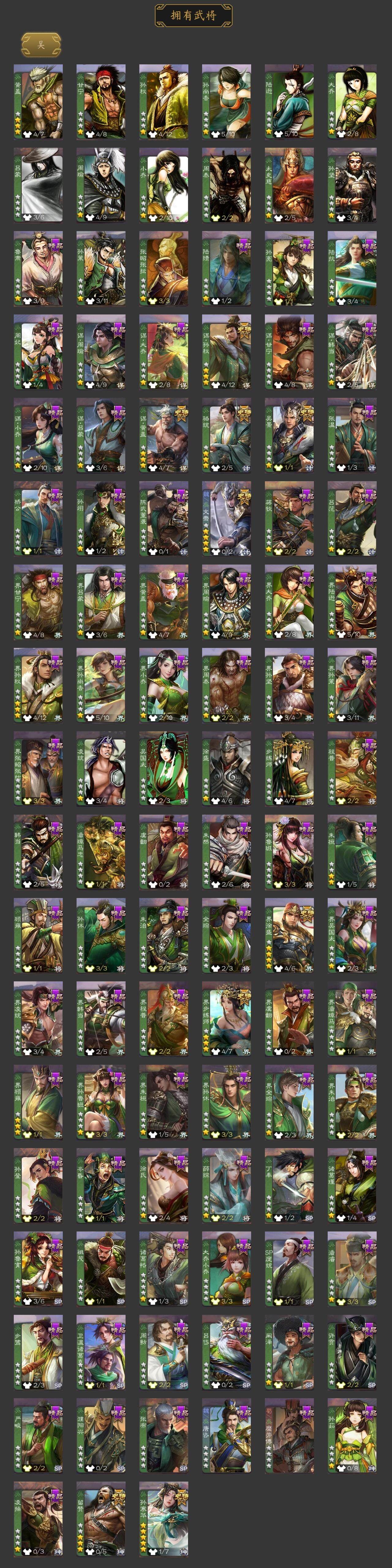 神吕布,神赵云,神陆逊,神刘备,神甘宁,神张辽,神郭嘉,神太史慈,神孙策,神荀彧,神诸葛亮,SP司马昭,郭女王,星周不疑,谋曹仁,王粲,谋曹操,杨修,王元姬,马钧,界钟会,界于禁,界曹真,嵇康,郝昭,陈琳,曹纯,戏志才,程昱,关索,谋诸葛亮,谋刘备,谋黄忠,谋夏侯氏,谋赵云,谋马