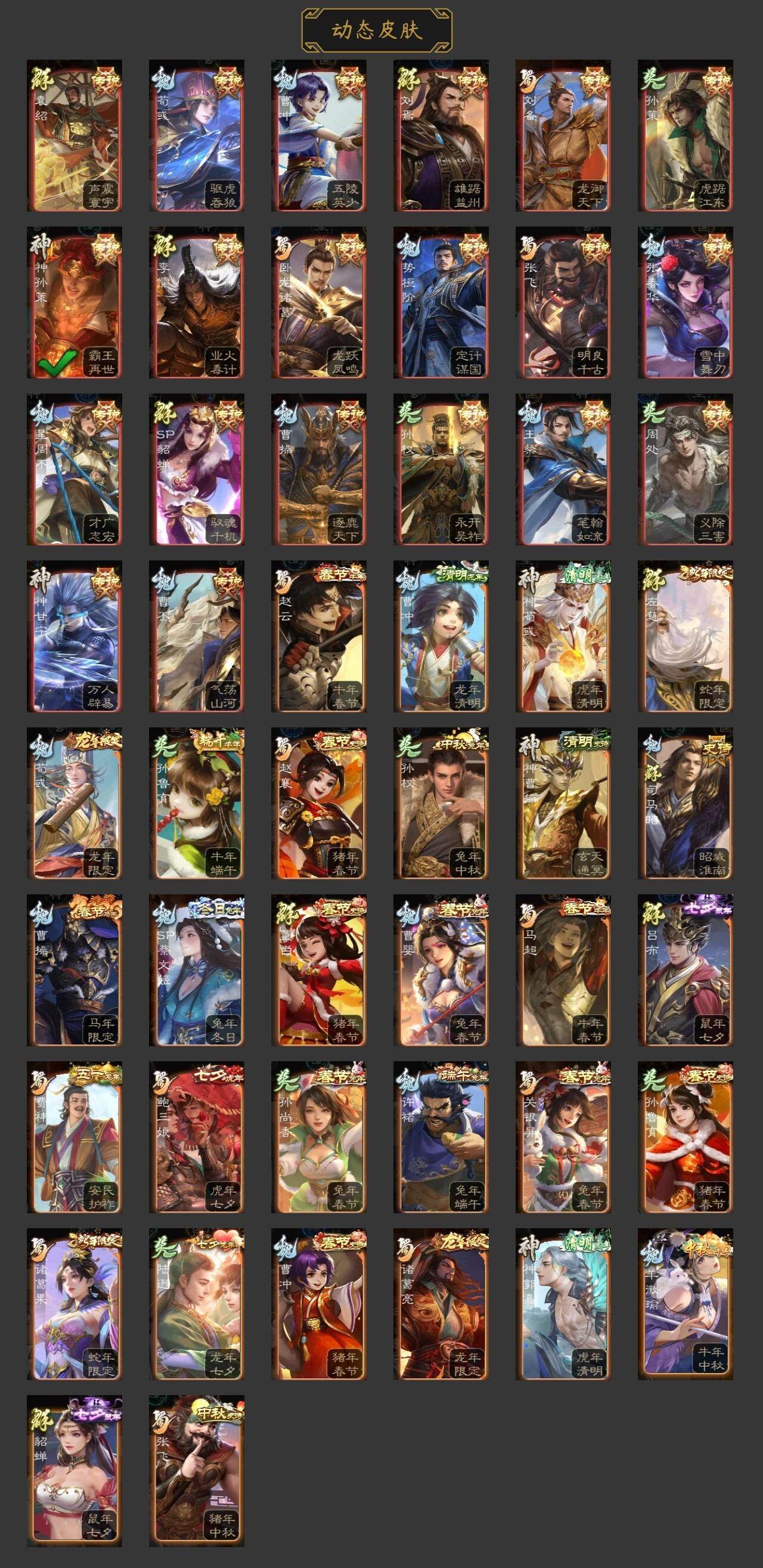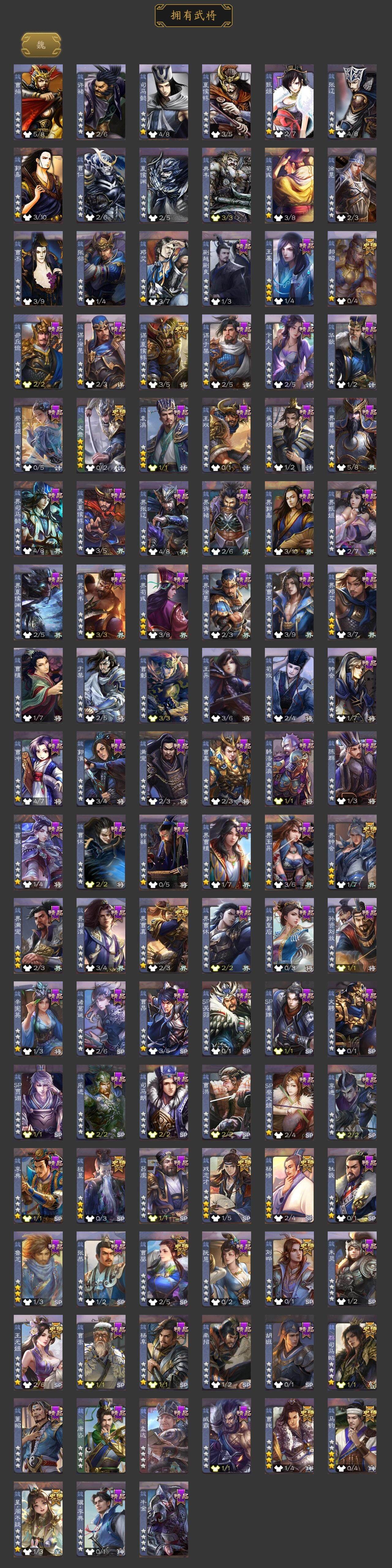 神赵云,神陆逊,神刘备,神甘宁,神张辽,神郭嘉,神太史慈,神孙策,神荀彧,神华佗,星周不疑,杨修,王元姬,马钧,界钟会,界曹真,郝昭,曹婴,曹纯,戏志才,刘晔,谋夏侯惇,程昱,关索,谋黄忠,谋赵云,谋马超,诸葛瞻,沙摩柯,谯周,界黄忠,花鬘,董允,谋关羽,骆统,留赞,界徐盛,文