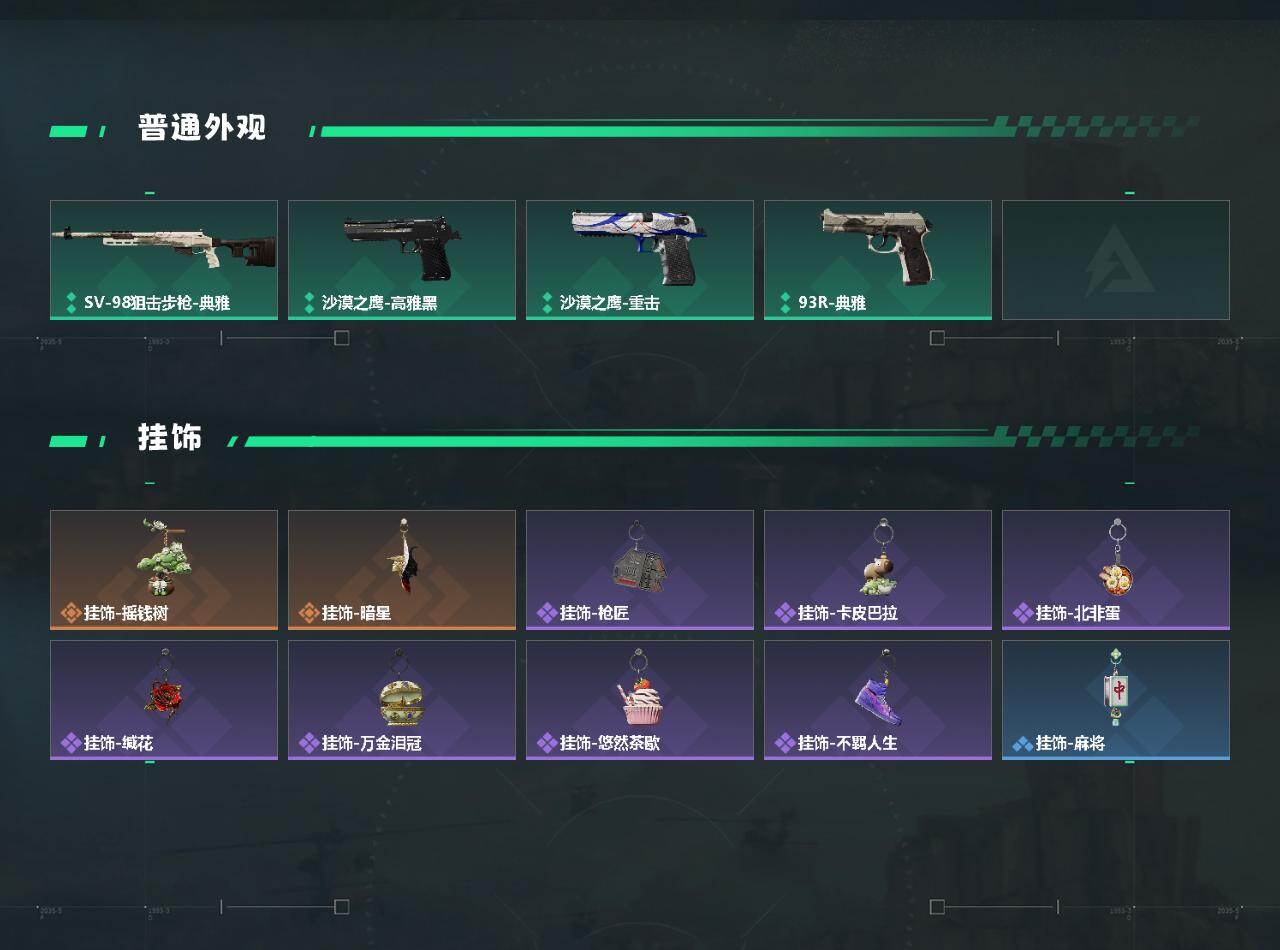 【传说外观】:AUG突击步枪-悠然茶歇,SCAR-H战斗步枪-水墨云图,腾龙突击步枪-万金泪冠,MK47突击步枪-悠然茶歇,MK47突击步枪-暗星,UZI冲锋枪-悠然茶歇,SR-3M紧凑突击步枪-暗星,勇士冲锋枪-万金泪冠,QCQ171冲锋枪-不羁人生,M14射手步枪-蛮荒,M14射手步枪-缄花,SR-