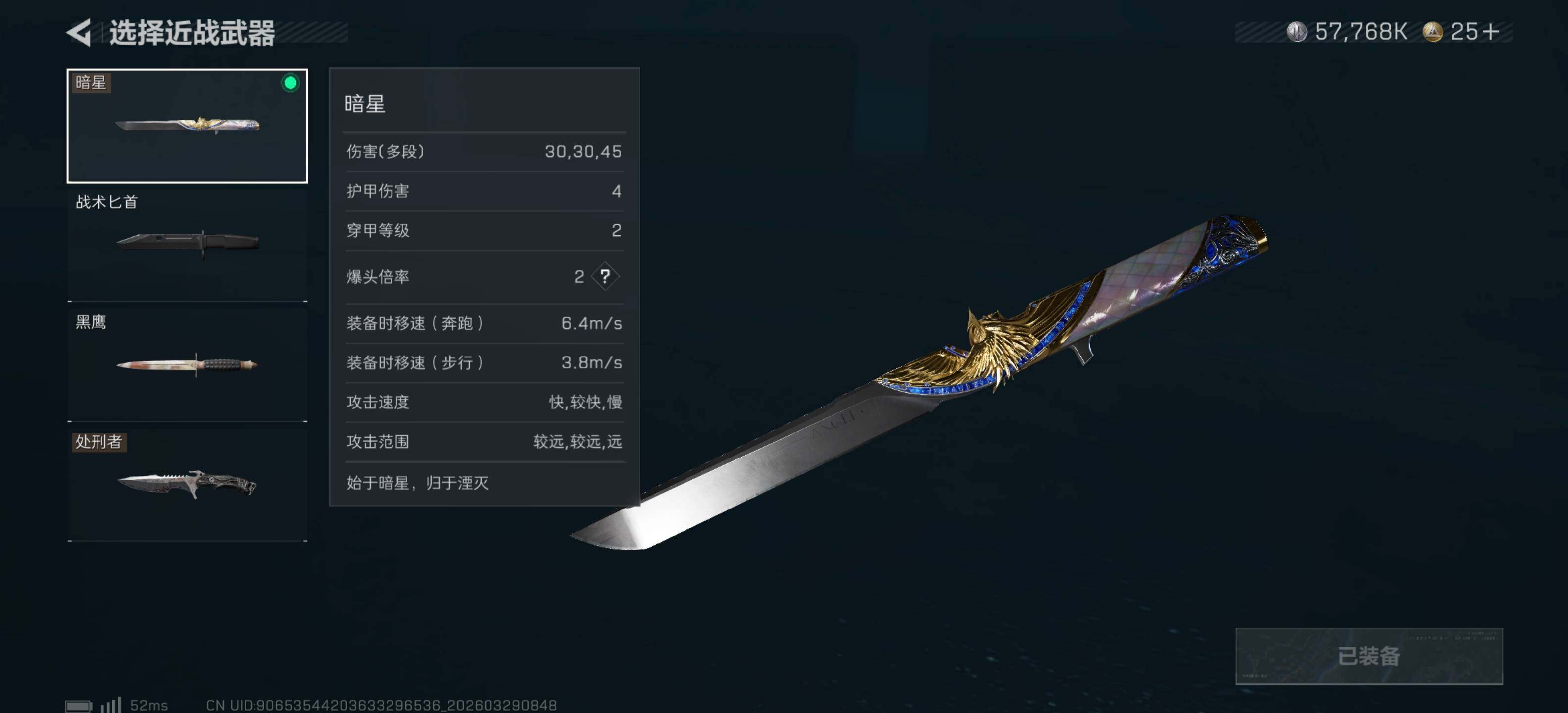 【近战皮肤】:近战-暗星,近战-处刑者2级,近战-黑鹰