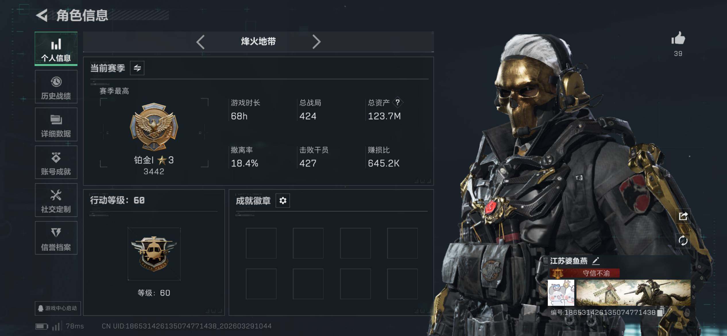123m总资产-3320k哈夫币-60烽火等级-铂金-33战场等级-军士长【