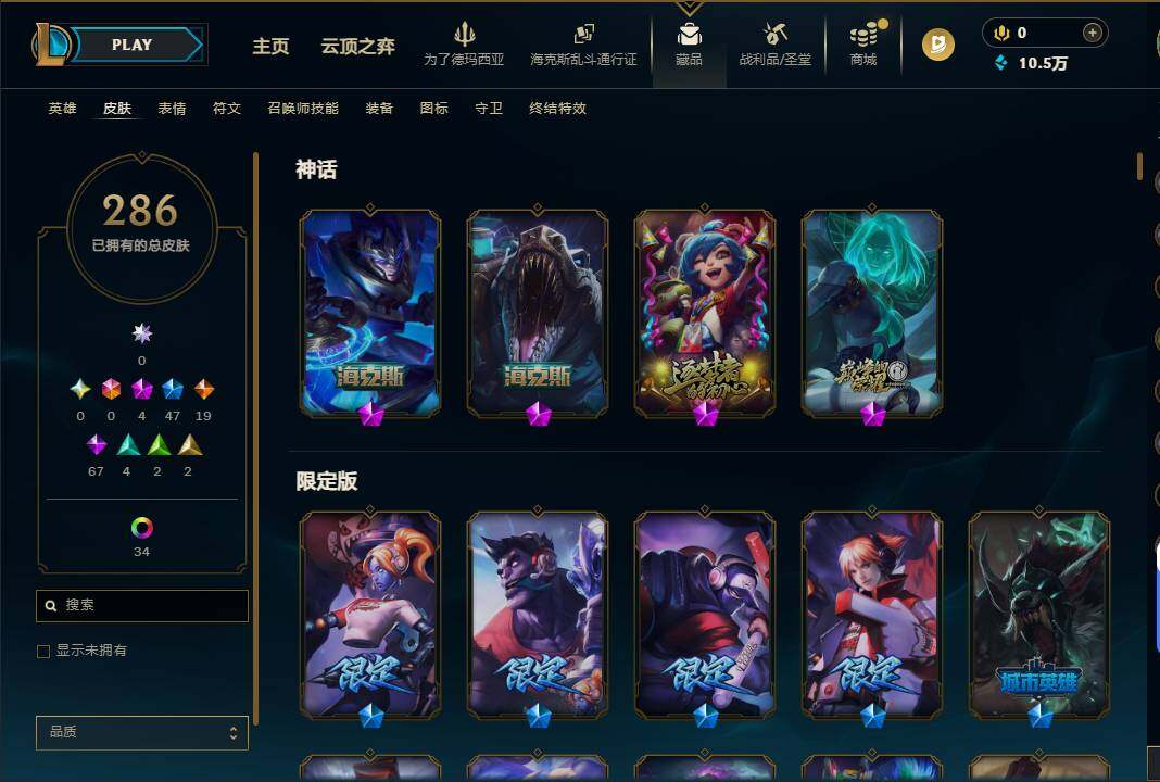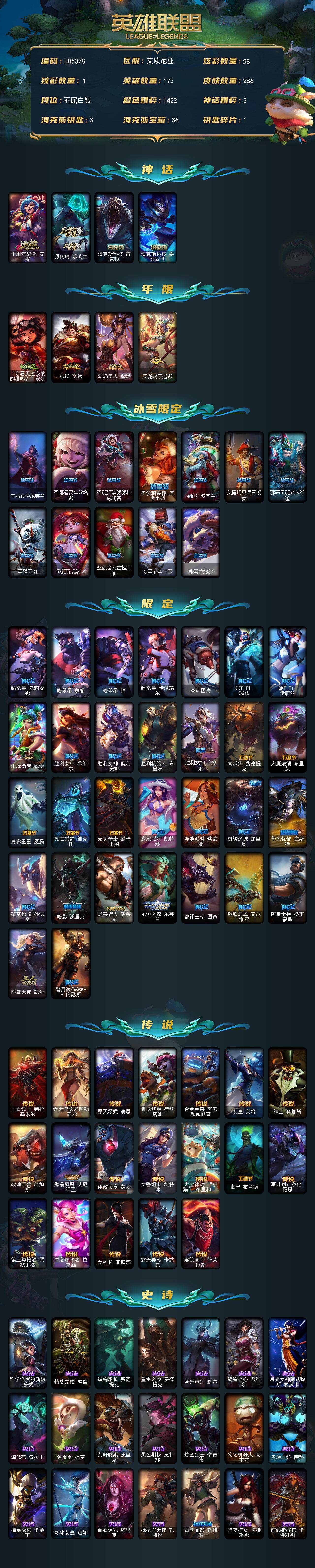 白银段位-172英雄-286皮肤-58炫彩-0终极-4神话-47限定-19传说-69史诗