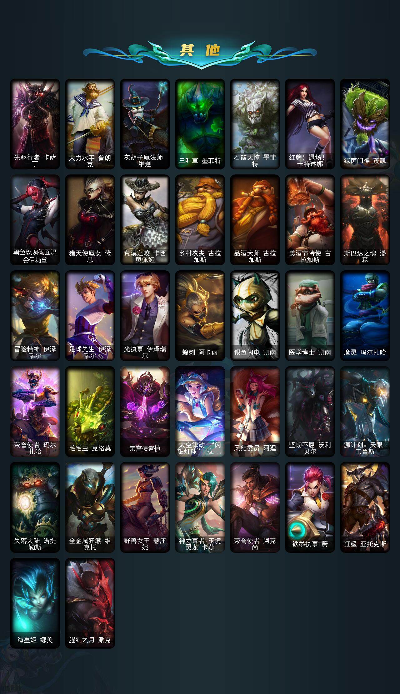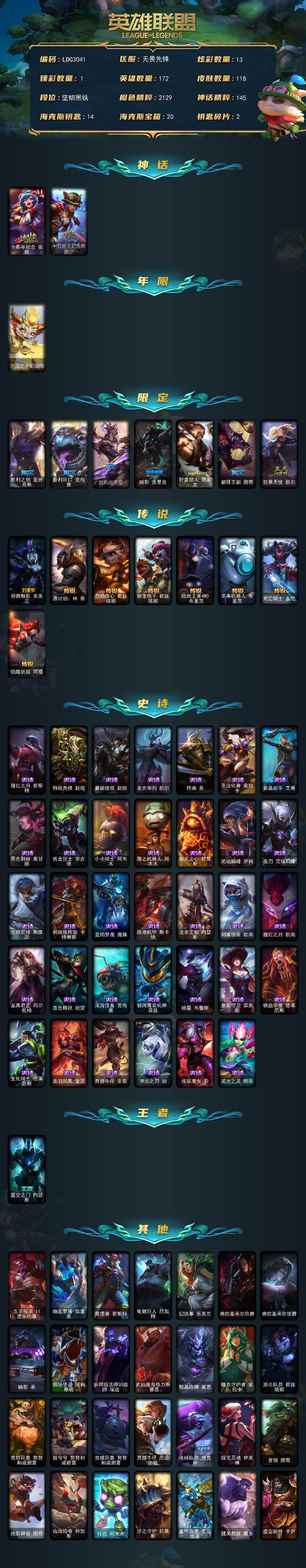 【LDC3041】172英雄/118皮肤/2神话/8限定/1臻彩/13炫彩/8传说/34史诗/未定级/十周年纪念安妮/十五周年纪念希维尔/魔女阿卡丽虚荣/天龙之子斯莫德/胜利之剑亚托克斯/胜利巨口克格莫/胜利剑圣易/暗影沃里克/野兽猎人德莱文/都铎王朝图奇/防暴天使凯尔/邪鸦魅影乐芙兰/源计划林易/烈焰雄心崔丝塔娜/驯龙炮手崔丝塔娜/陆地王者4WD布里茨/苹果机器人布里茨/死亡骑士盖伦/焰尾妖狐阿狸/腥红之月崔斯特/特战先锋赵信/翼骑统领赵信/圣光审判凯尔/侍魂易/圣洁化身索拉卡/紫晶射手艾希/
