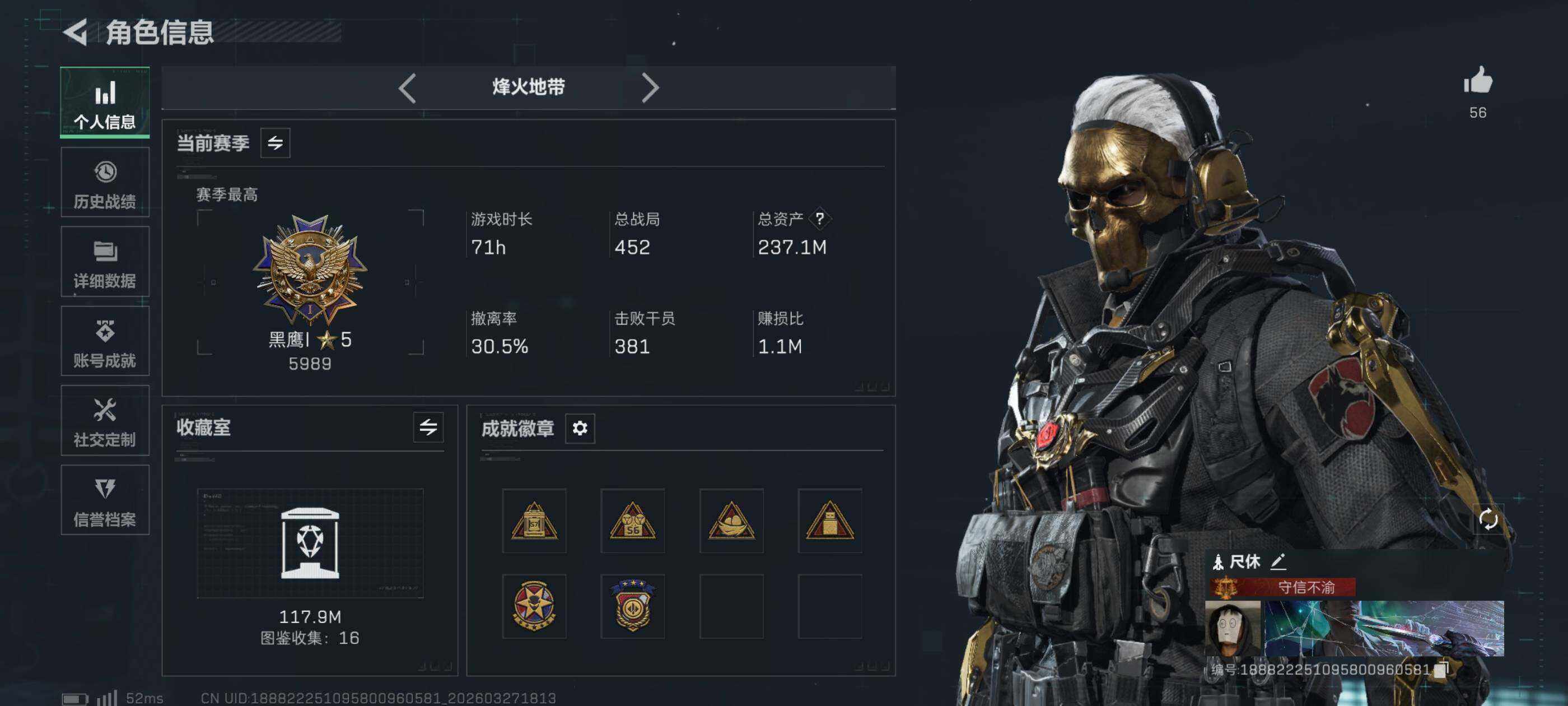 237m总资产-17198k哈夫币-60烽火等级-黑鹰-29战场等级-上等兵
